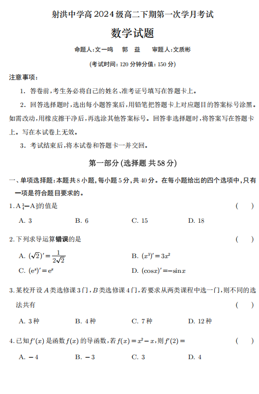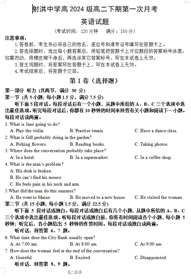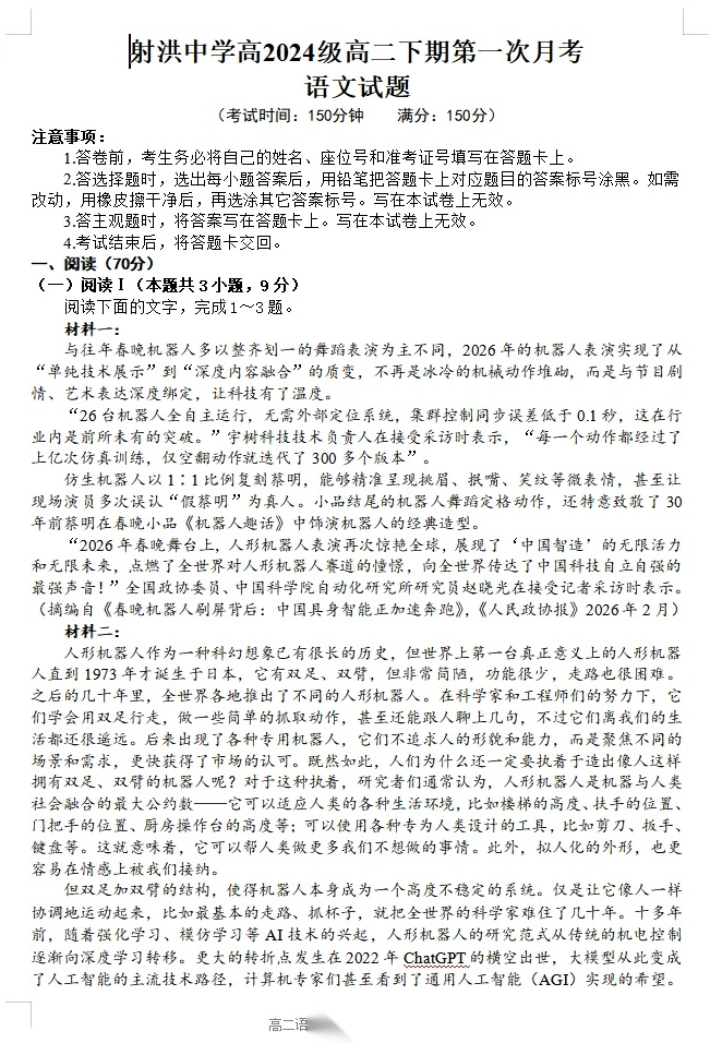 【四川卷】【高二】四川省遂宁市射洪中学2024级(2027届)2025-2026学年高二下学期第一次月考(4月初) 全科试题卷+答案