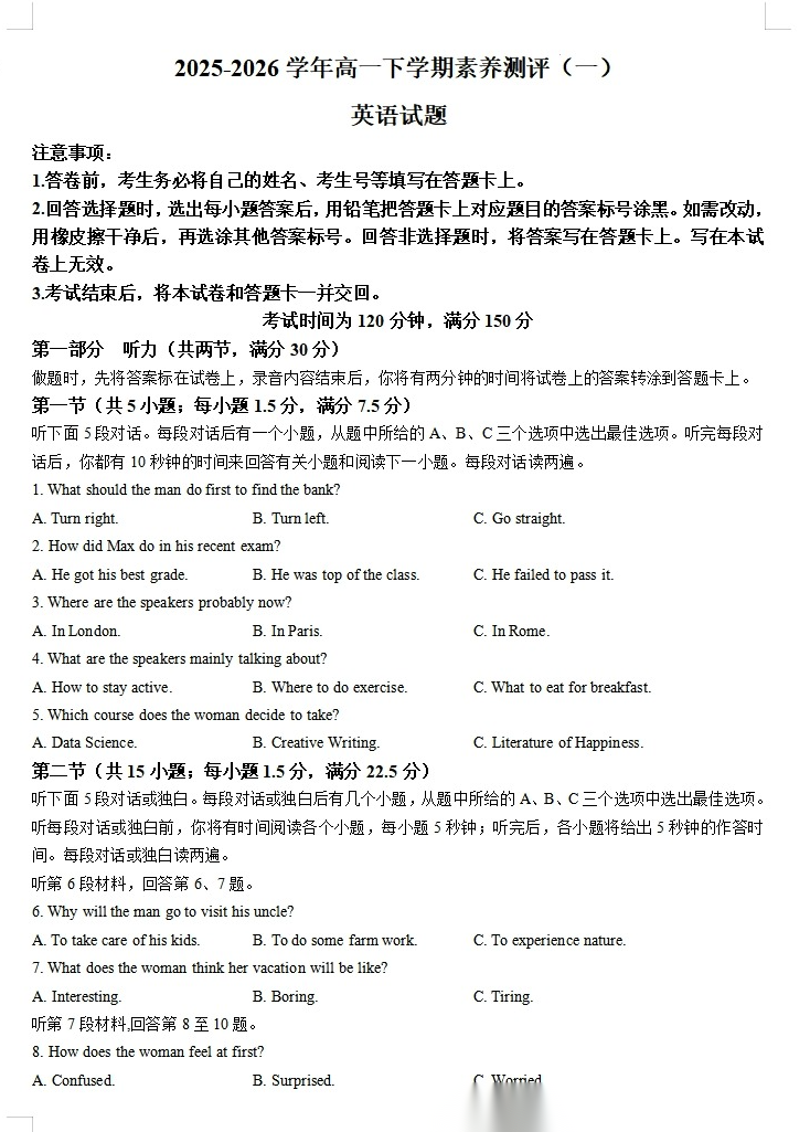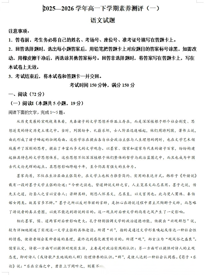 【河南卷】【高一】河南省(新乡市)百师联盟2025-2026学年高一下学期素养测评(一)(3月底) 全科试题卷+答案