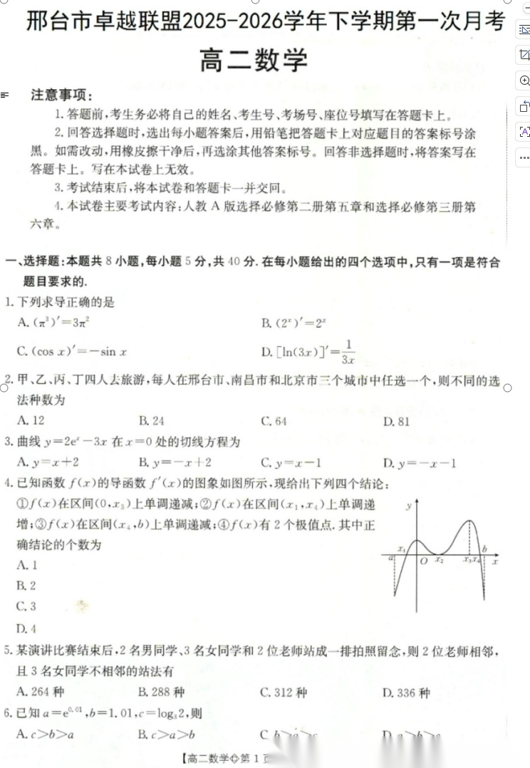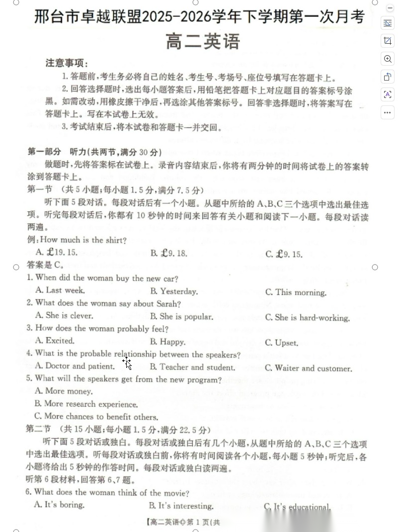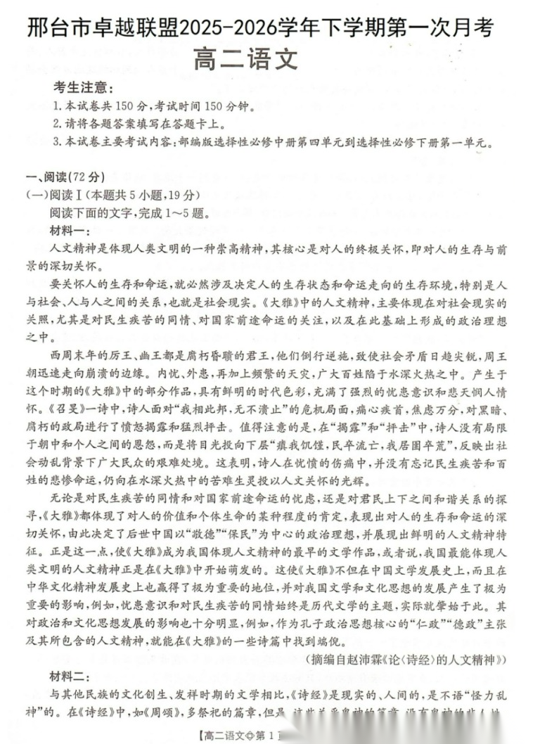 【河北卷】【高二】河北省金太阳邢台市卓越联盟2025-2026学年下学期高二年级第一次月考(4月))(26-315B)(4.10-4.11) 全科试题卷+答案