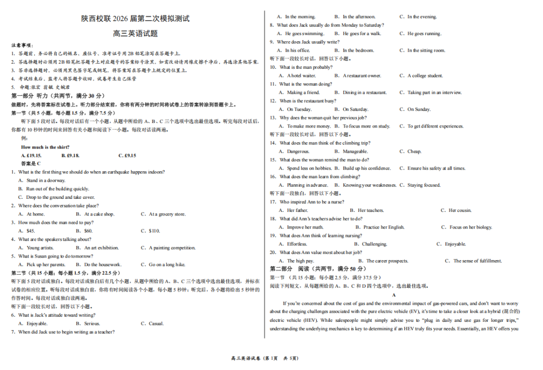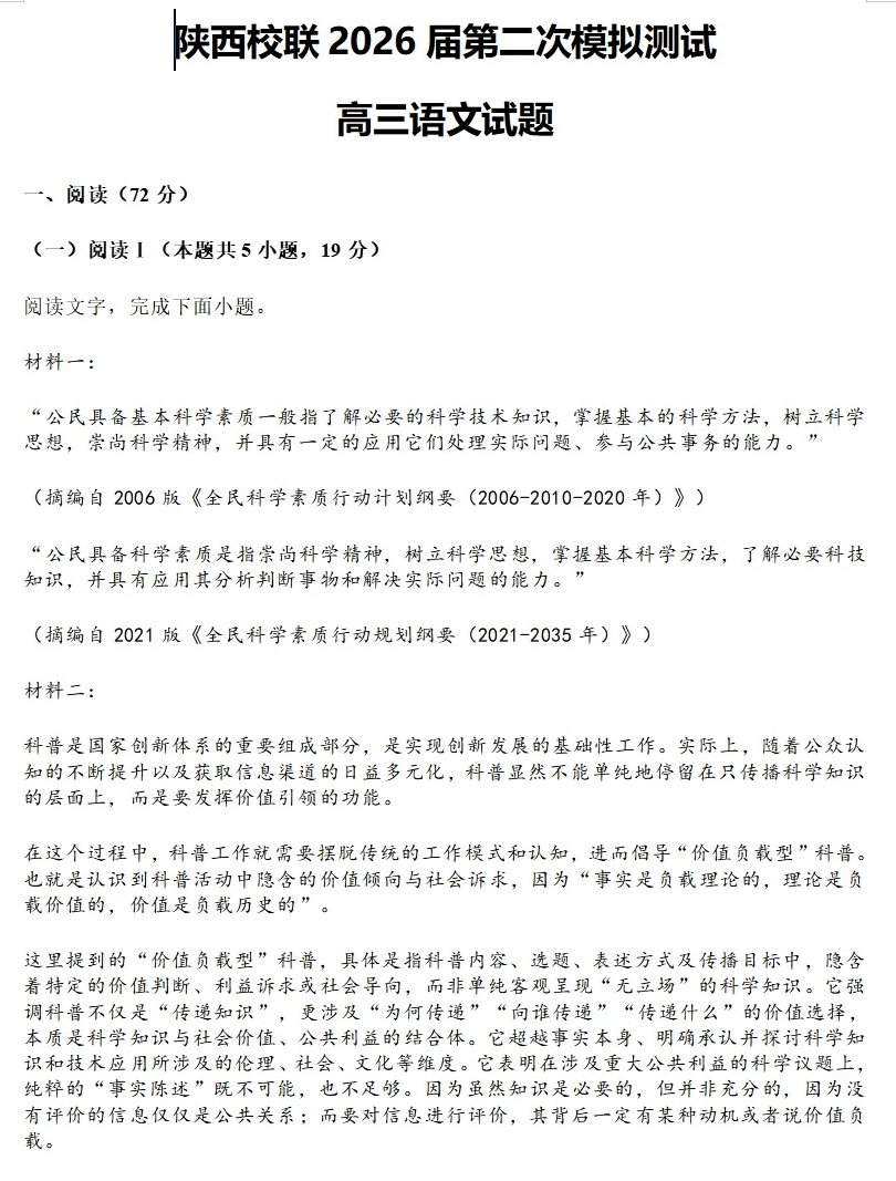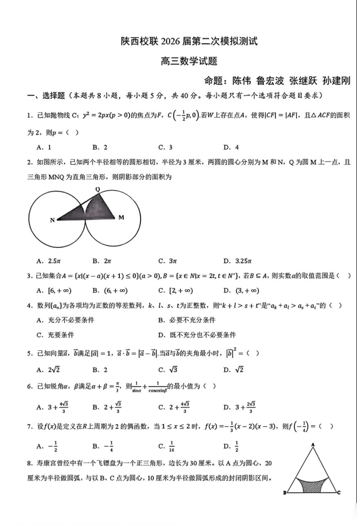 【西北卷】【陕西卷】陕西省校联(西安市,渭南市,榆林市三市等多校)2026届高三年级第二次模拟测试(校联二模)(4月初)