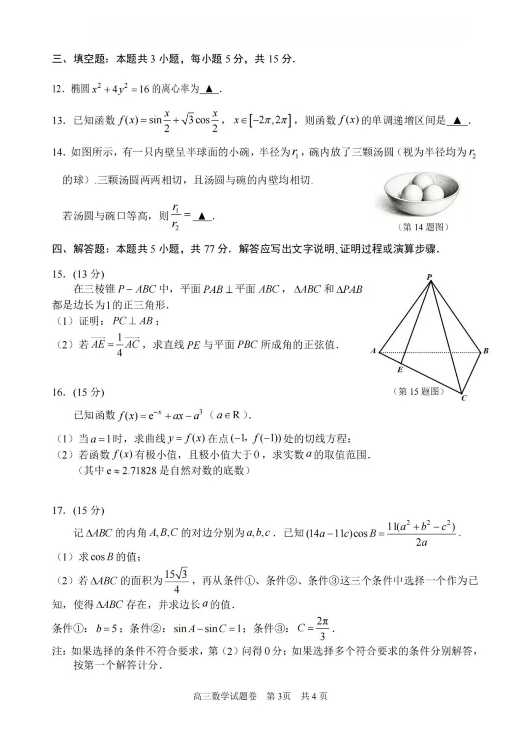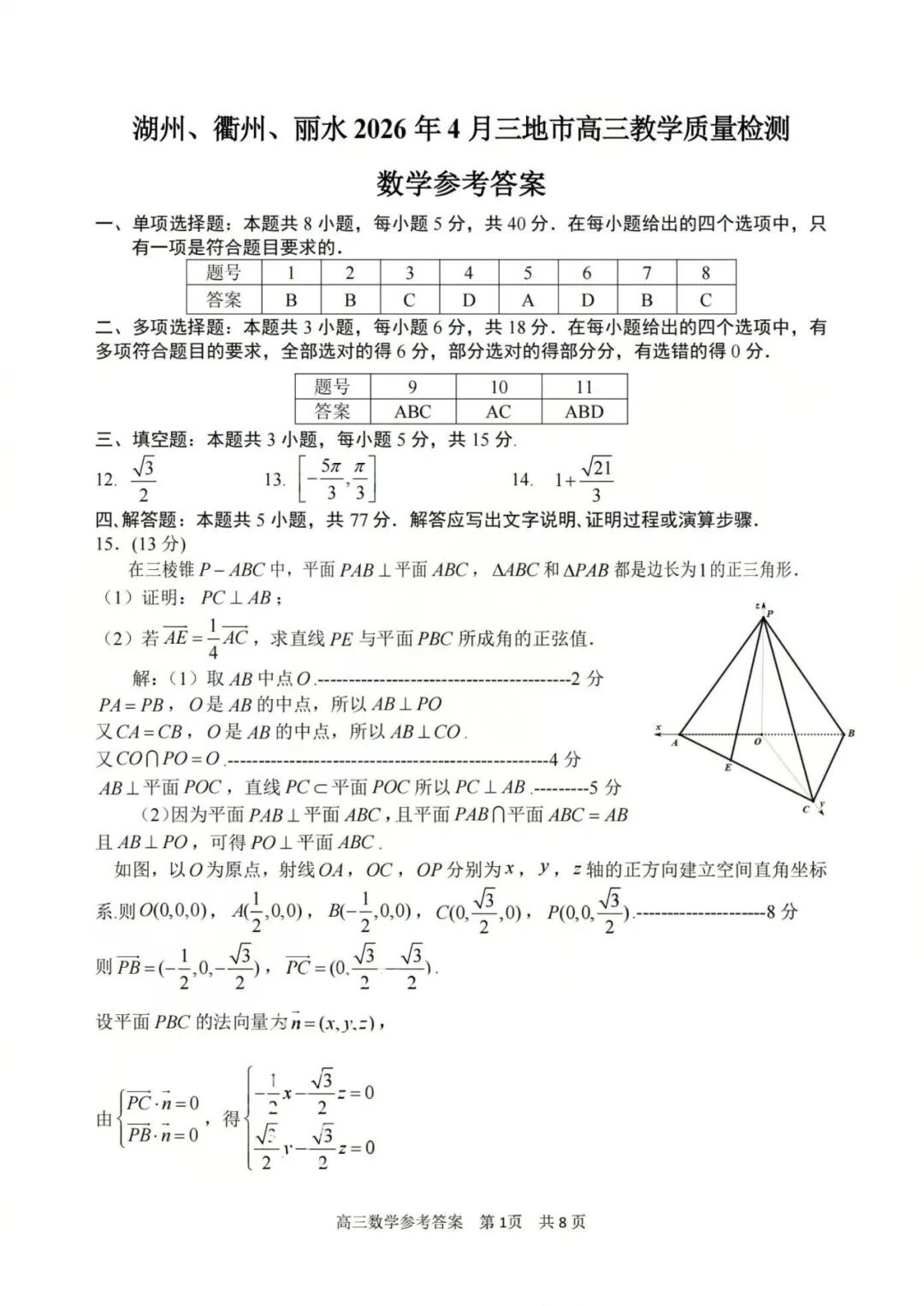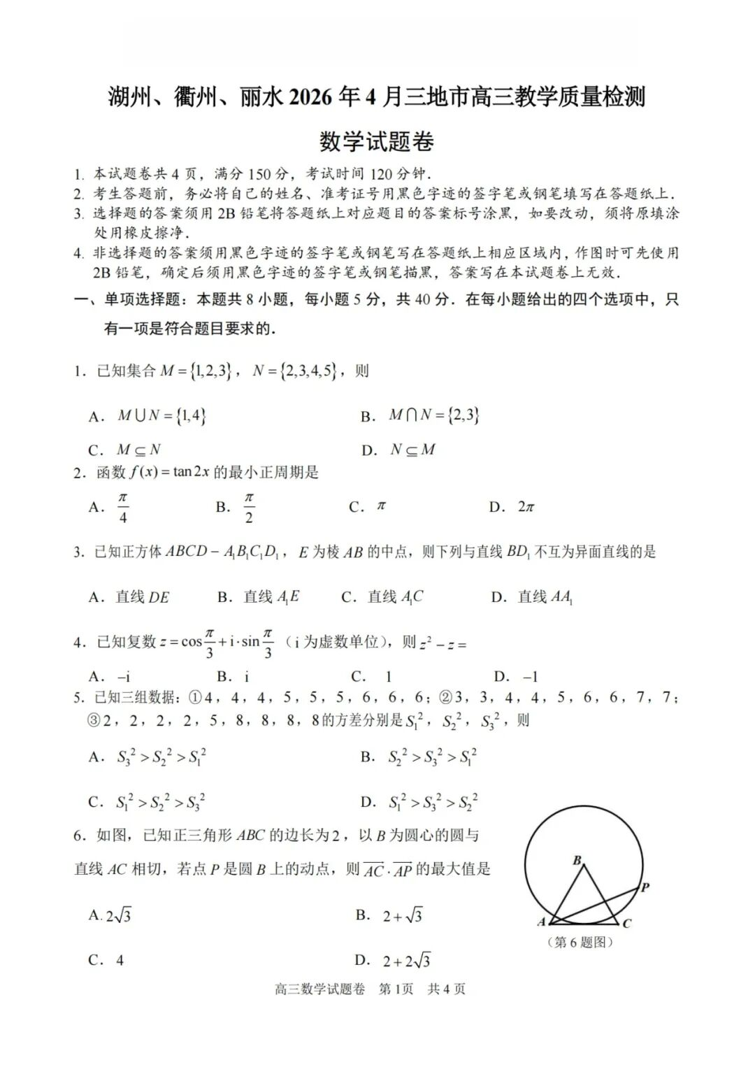 浙江省湖州、衢州、丽水2026年4月三地市高三教学质量检测