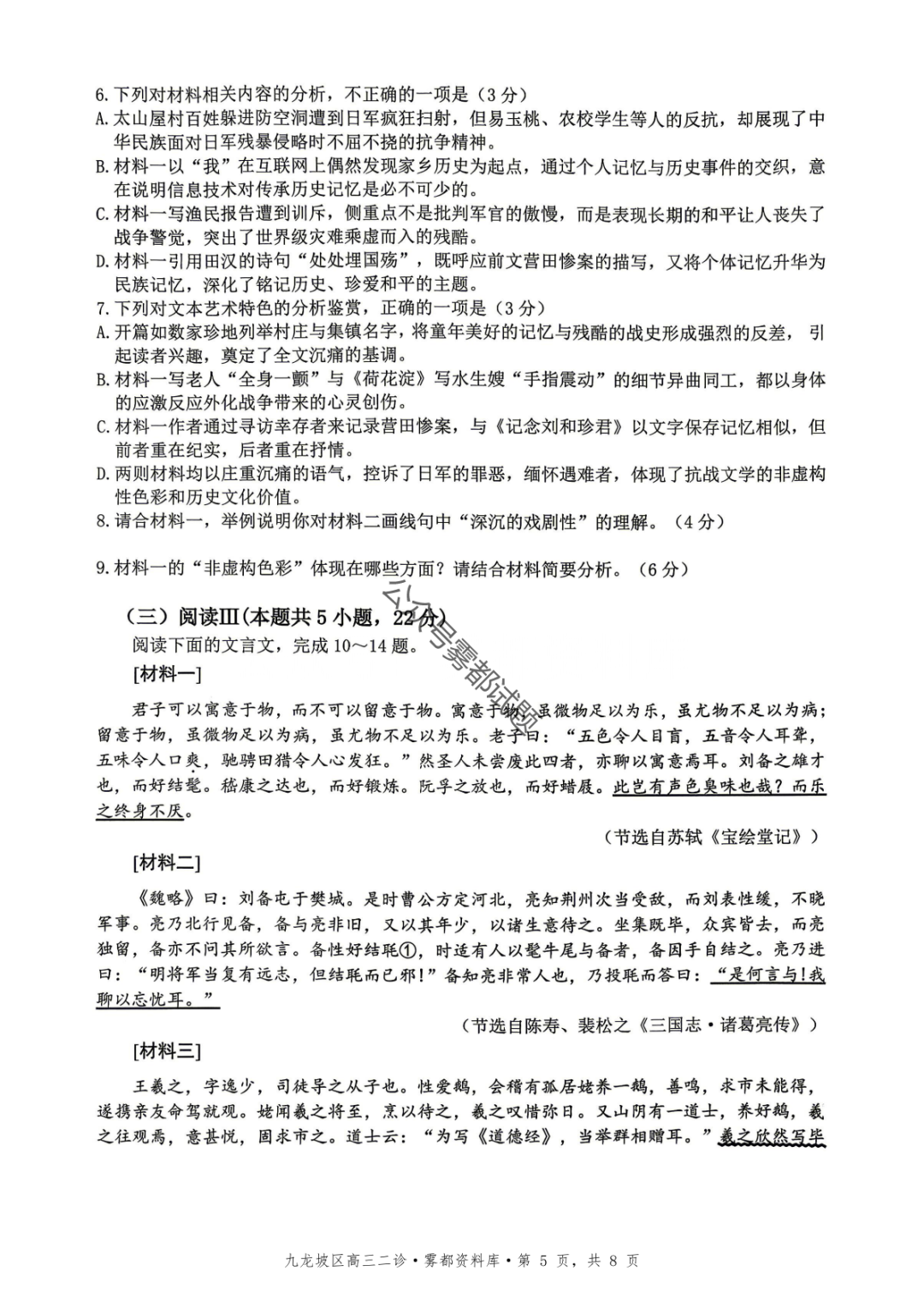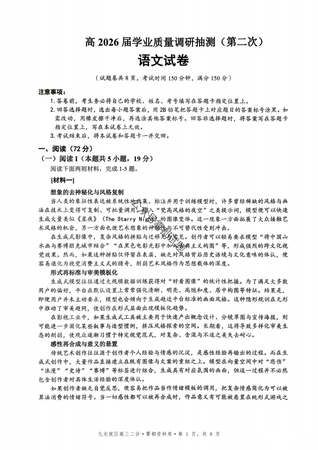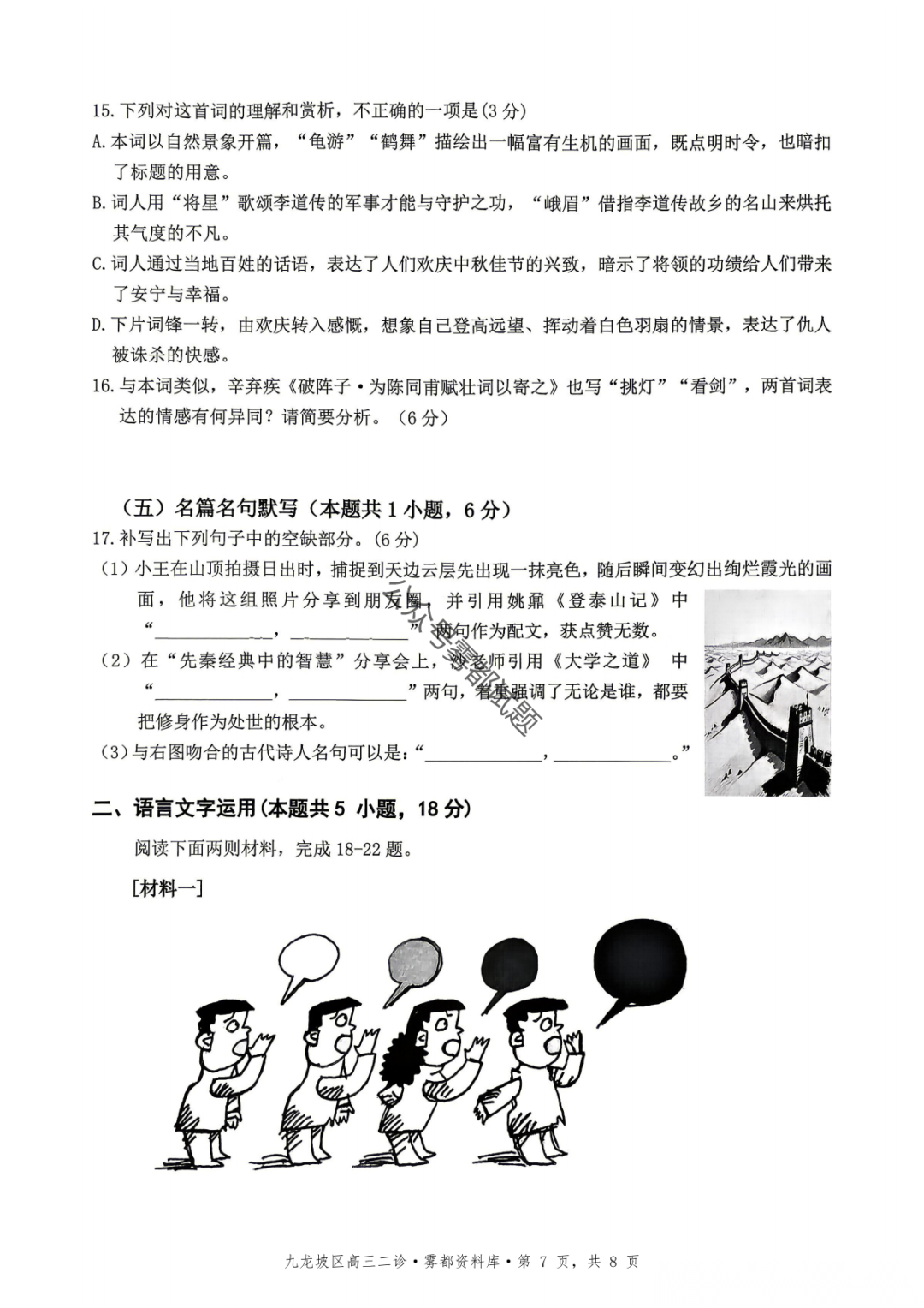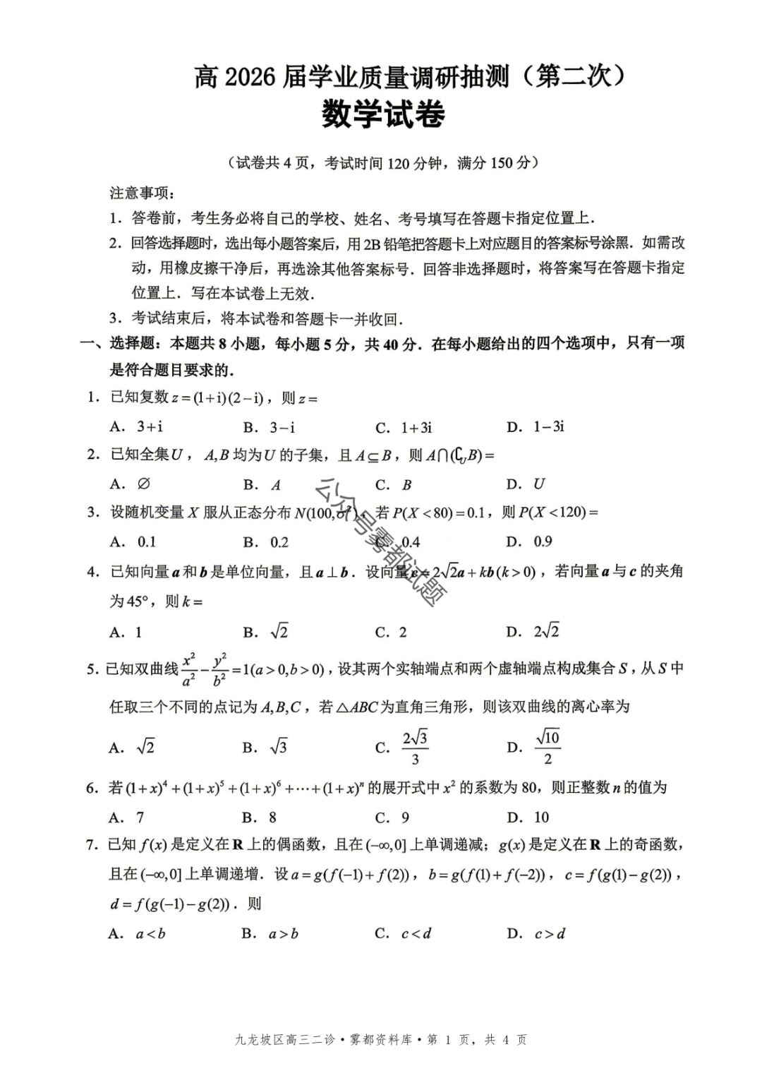 重庆九龙坡等五区高2026届学业质量调研抽测(第二次)语文、数学试题
