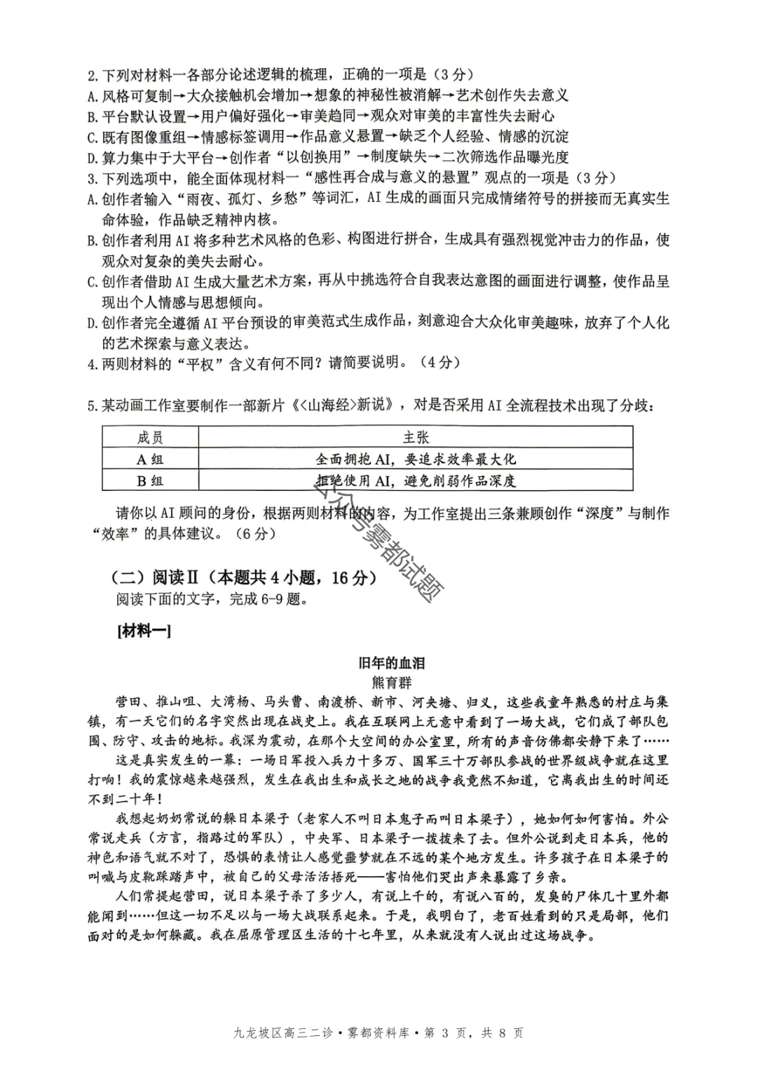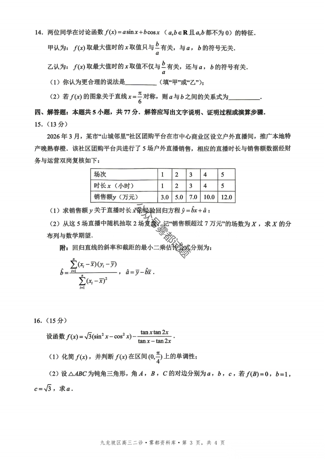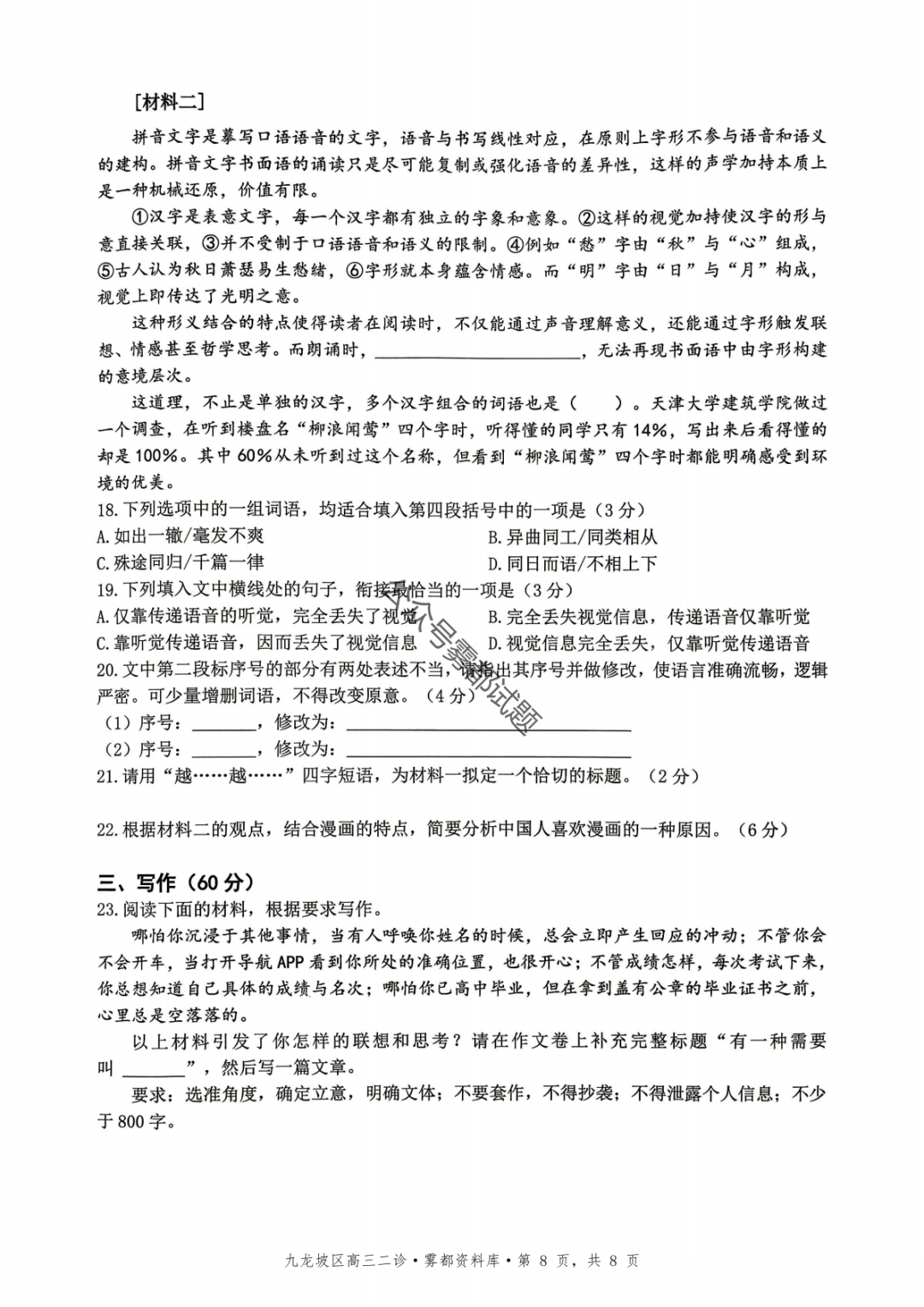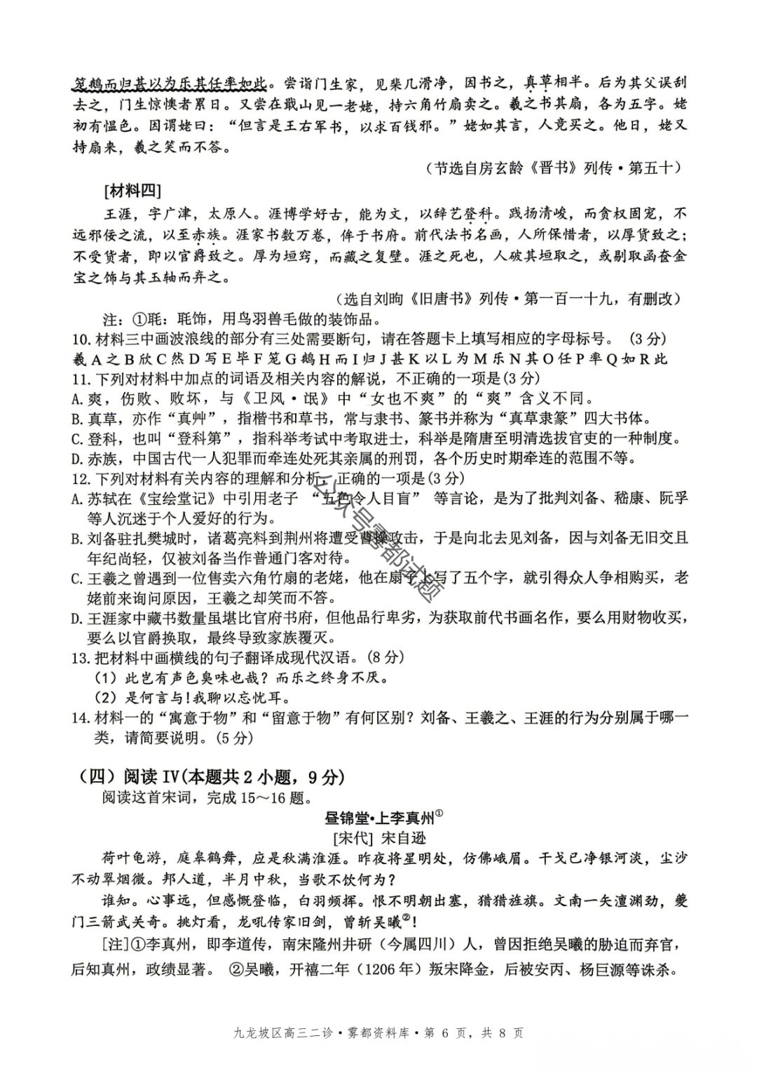 重庆九龙坡等五区高2026届学业质量调研抽测(第二次)语文、数学试题