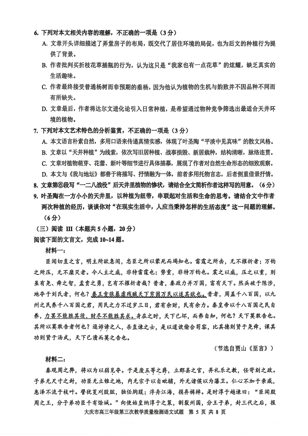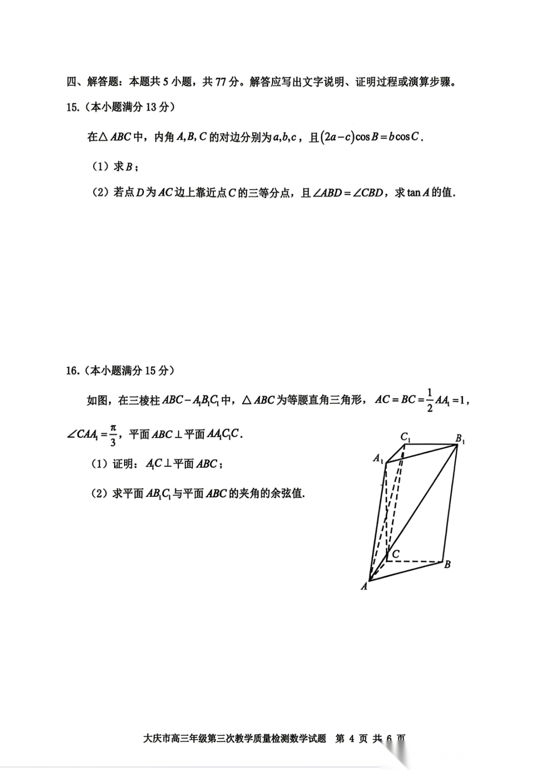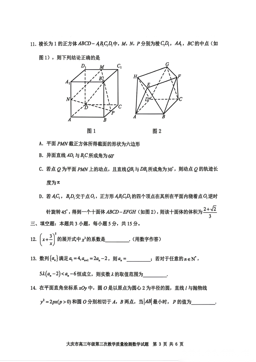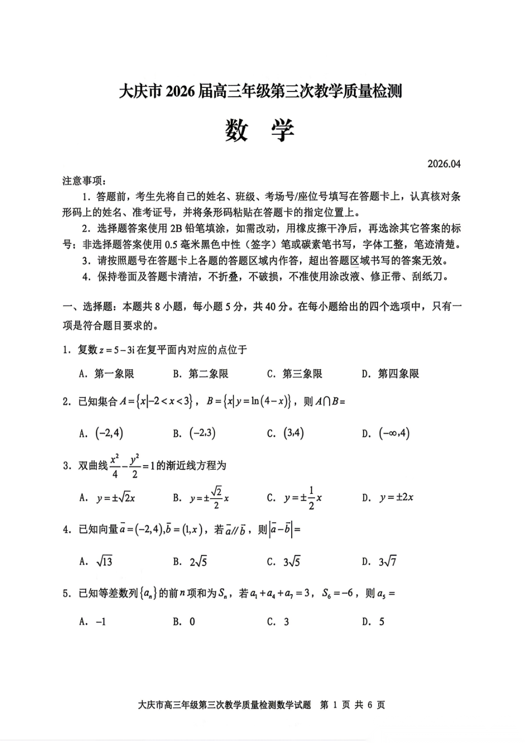 【大庆三模】黑龙江省大庆市2026届高三年级第三次教学质量检测试题答案