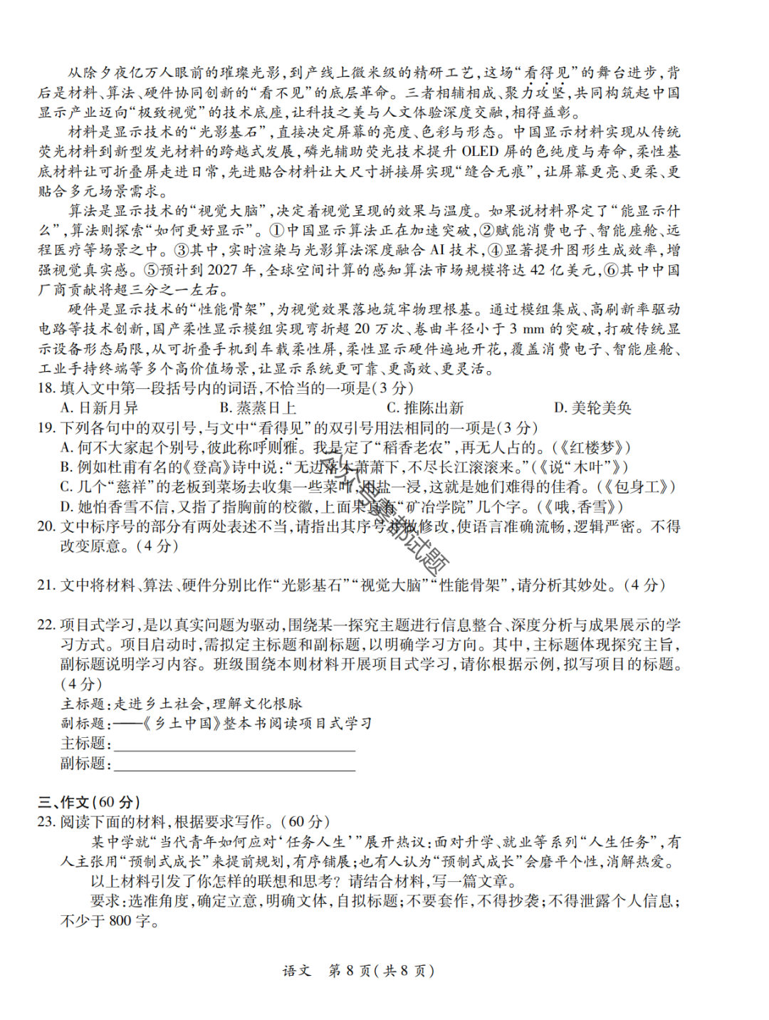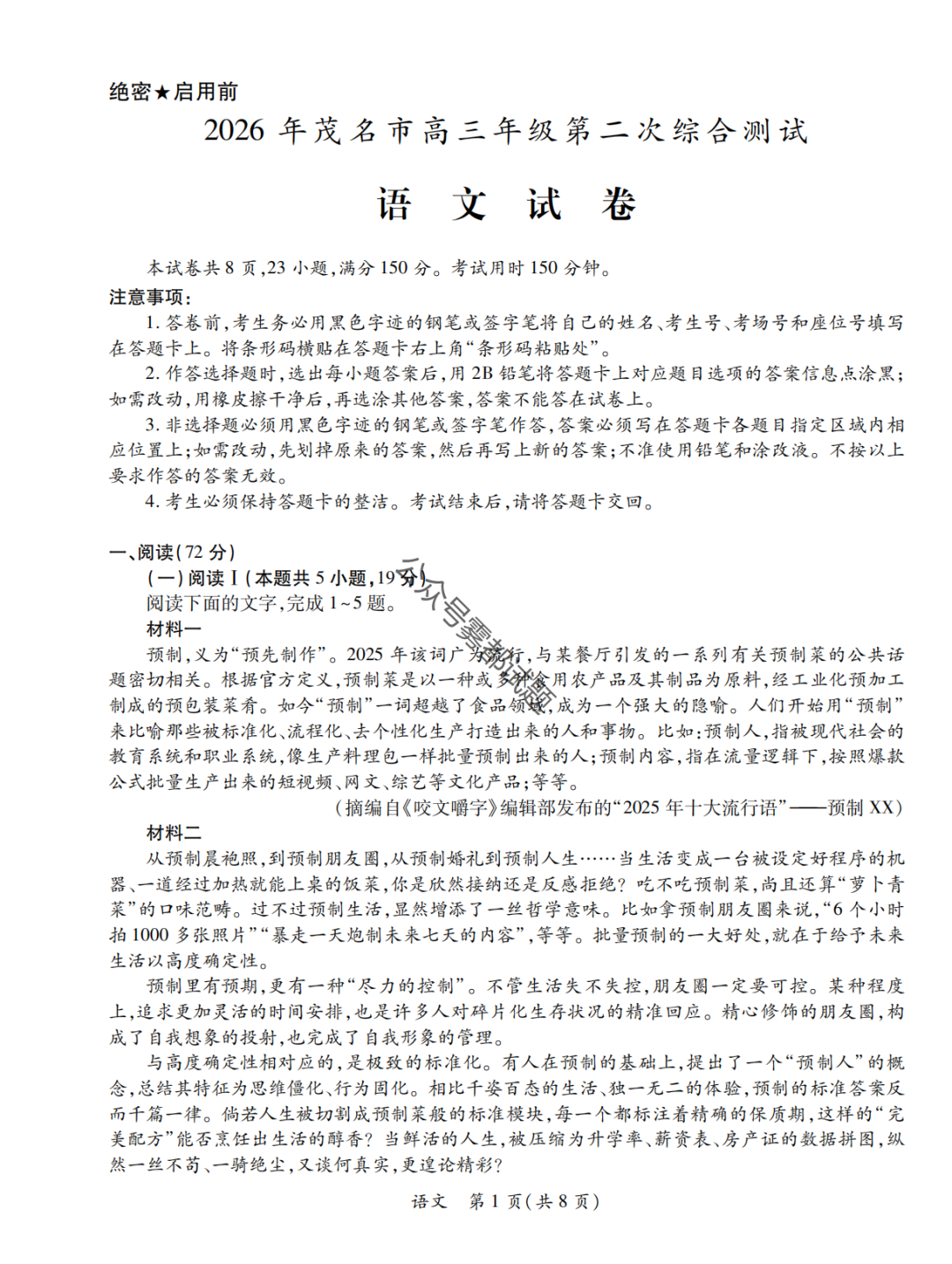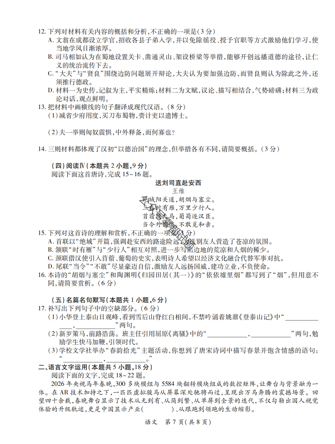重庆九龙坡等五区高2026届学业质量调研抽测(第二次)语文、数学试题 重庆九龙坡等五区高2026届学业质量调研抽测(第二次)语文、数学试题