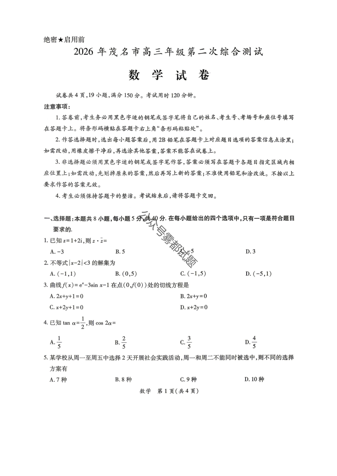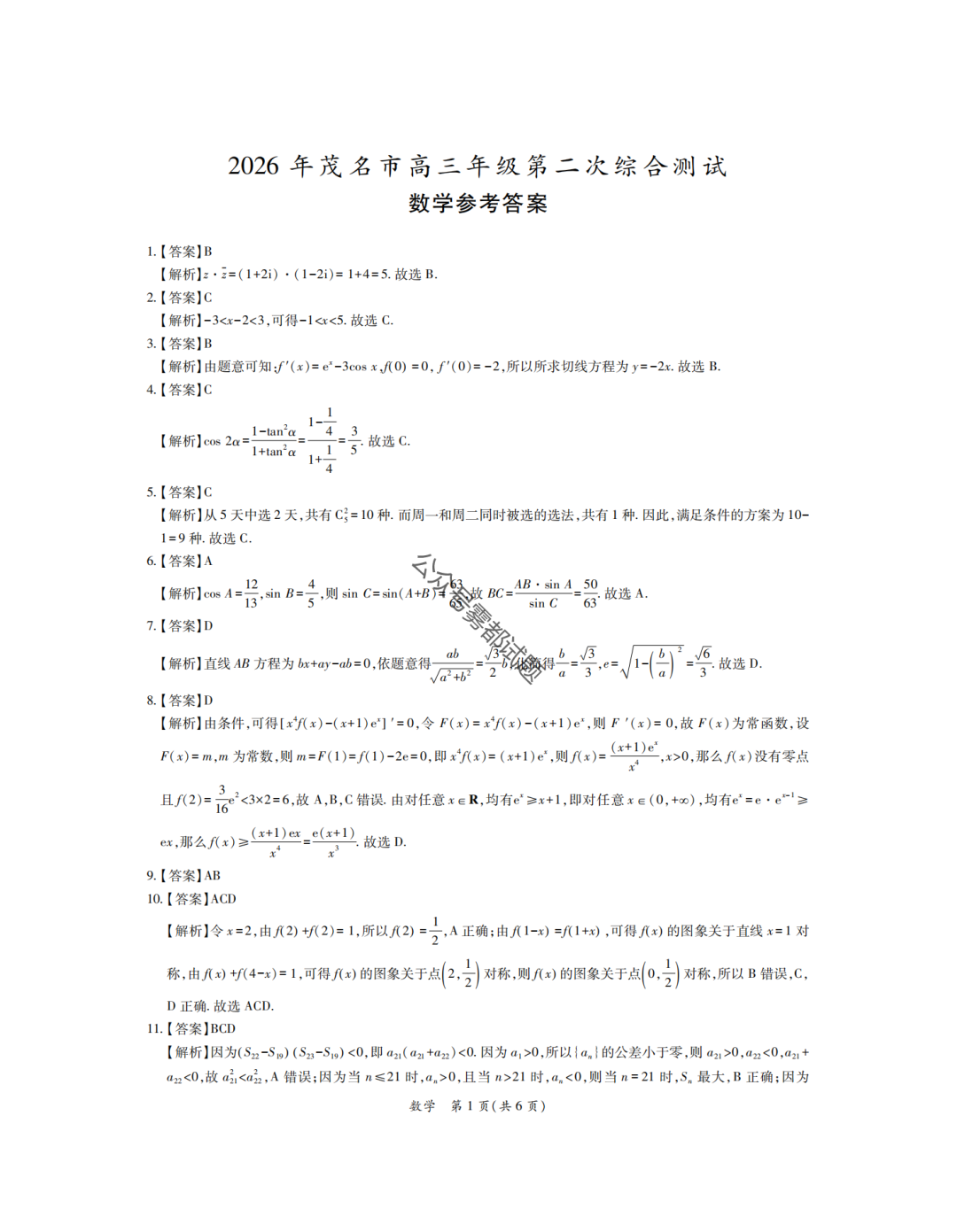 【茂名二模】2026年广东省茂名市高三年级第二次综合测试试题答案
