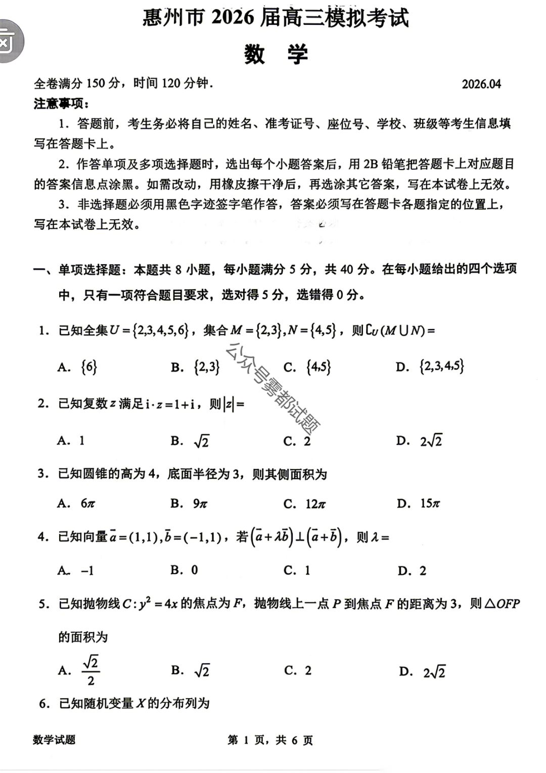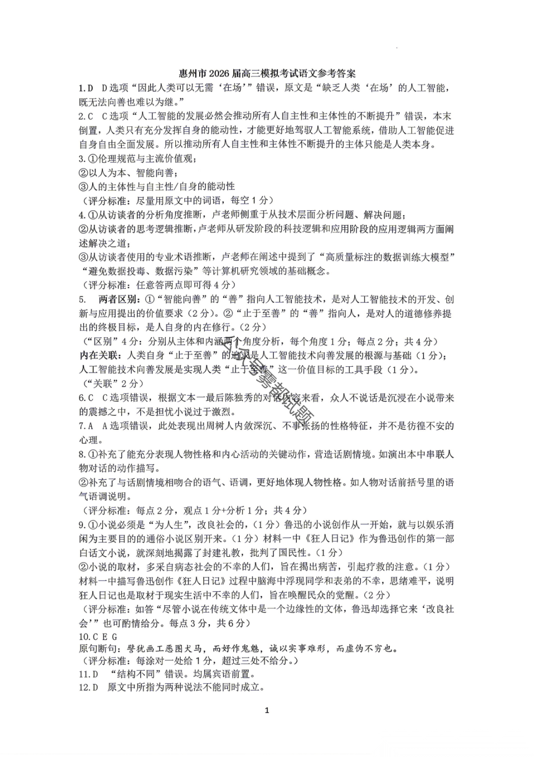 【惠州二模】广东省惠州市2026届高三模拟考试试题答案