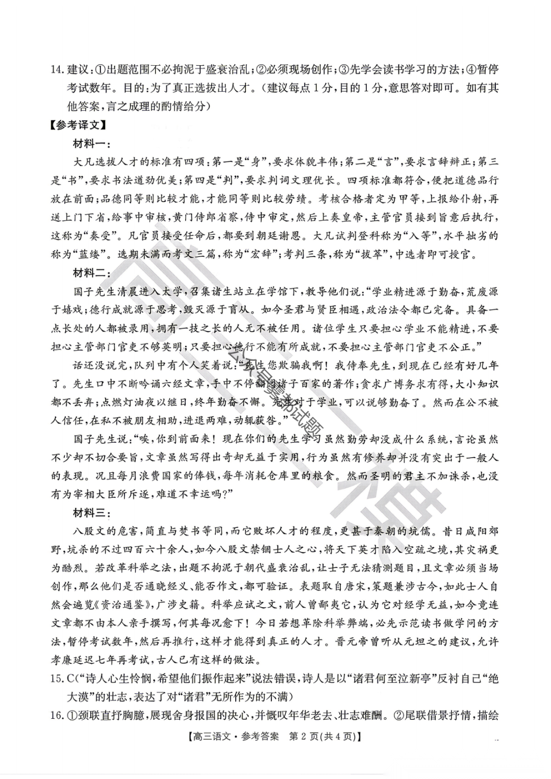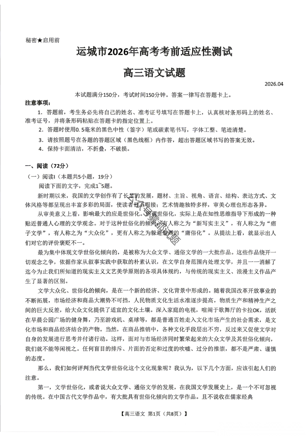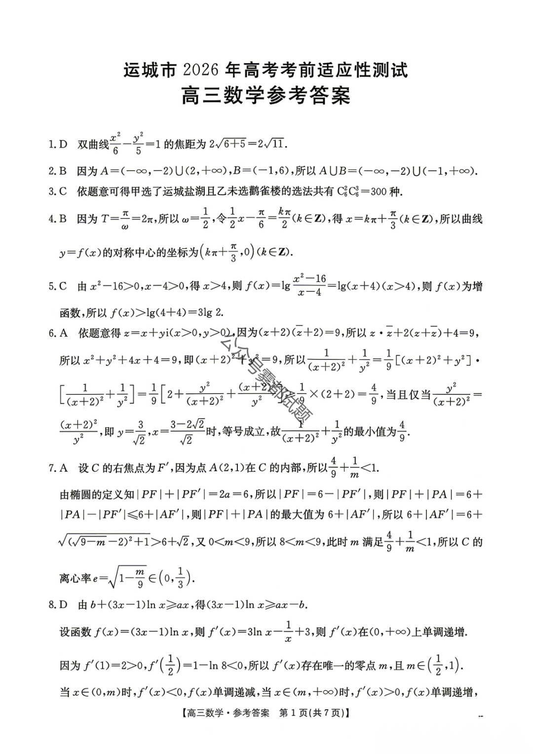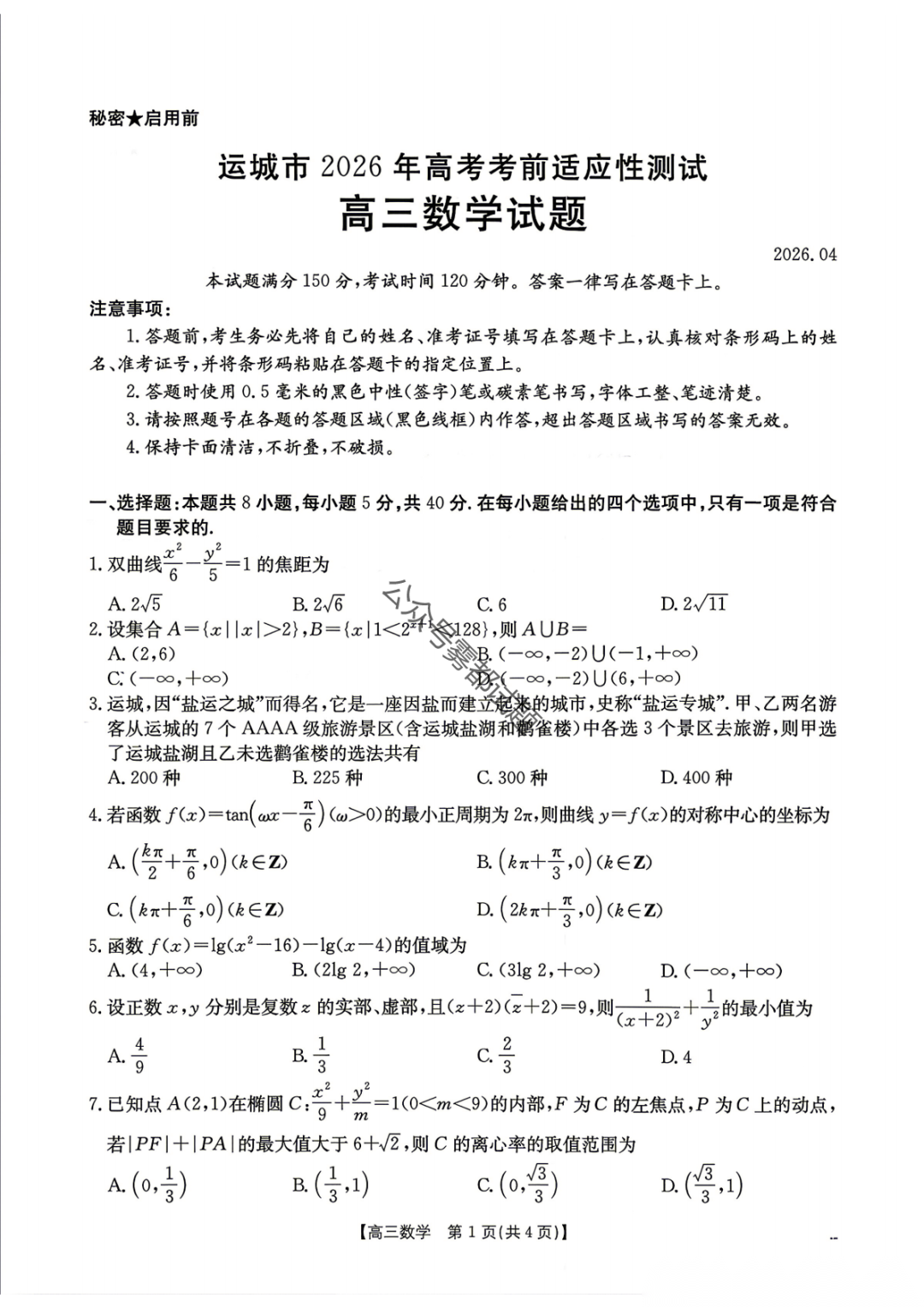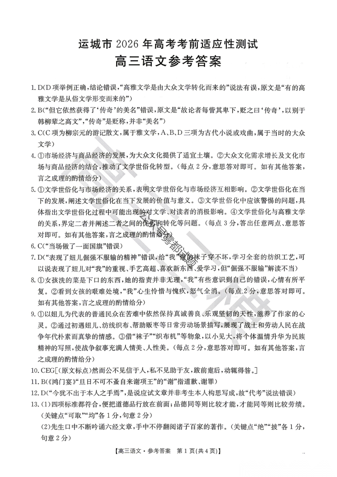【运城二模】运城市2026年4月高考考前适应性测试答案 【运城二模】运城市2026年4月高考考前适应性测试答案