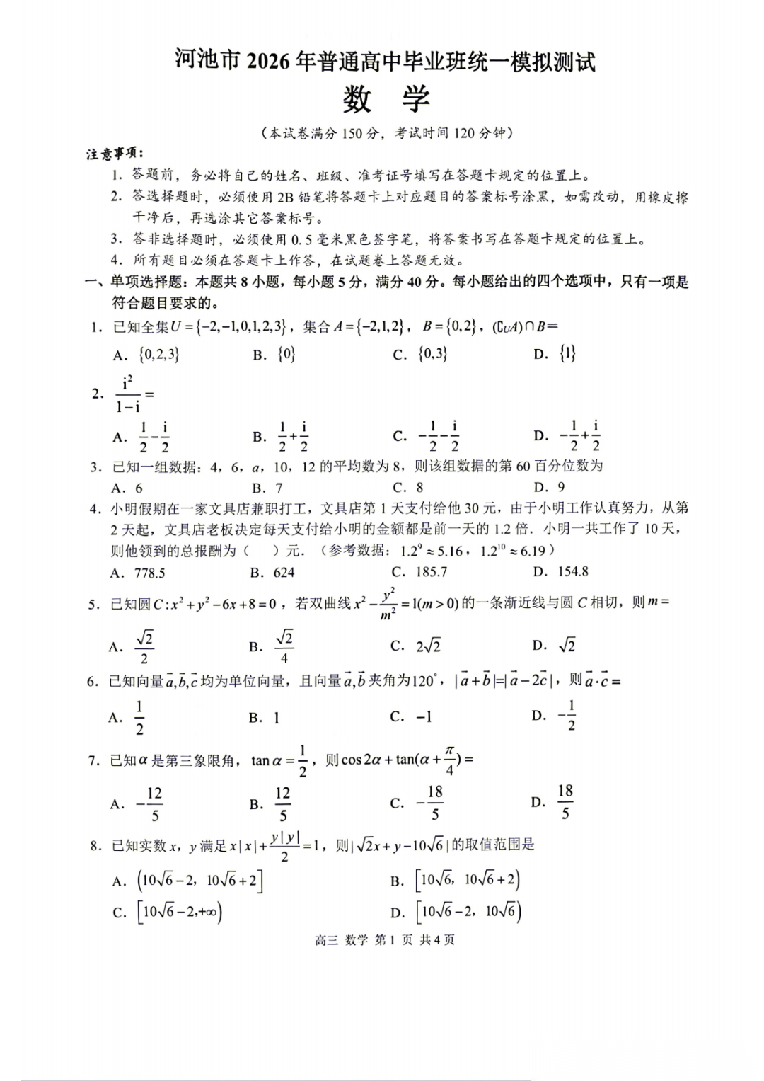【河池一模全科】广西自治区河池市2026年普通高中毕业班统一模拟测试