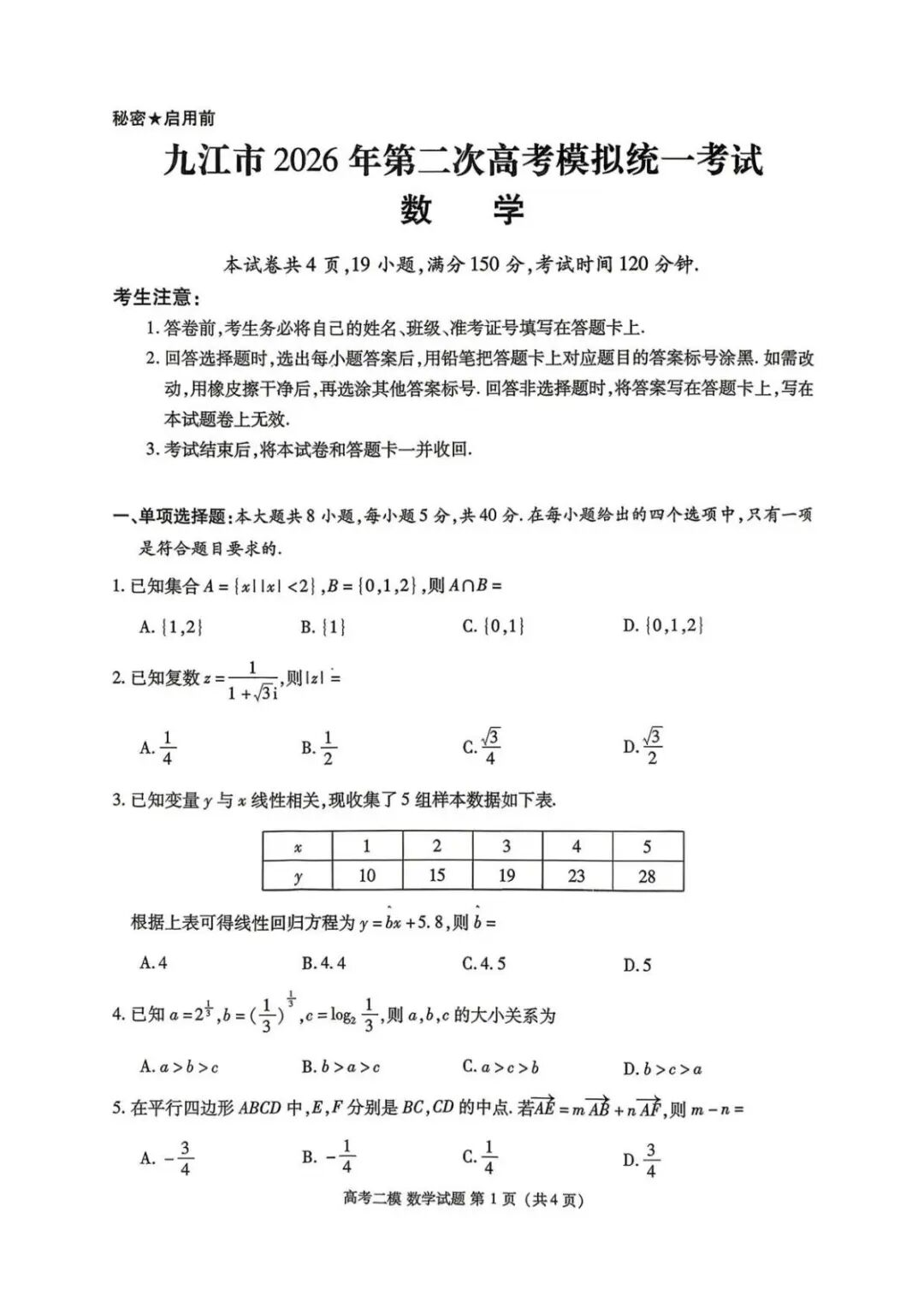 2026年江西九江高三二模模拟统一考试【九江二模】