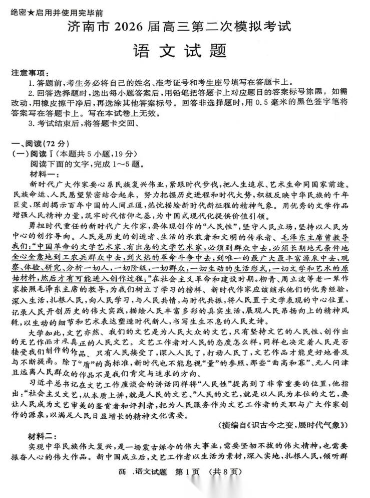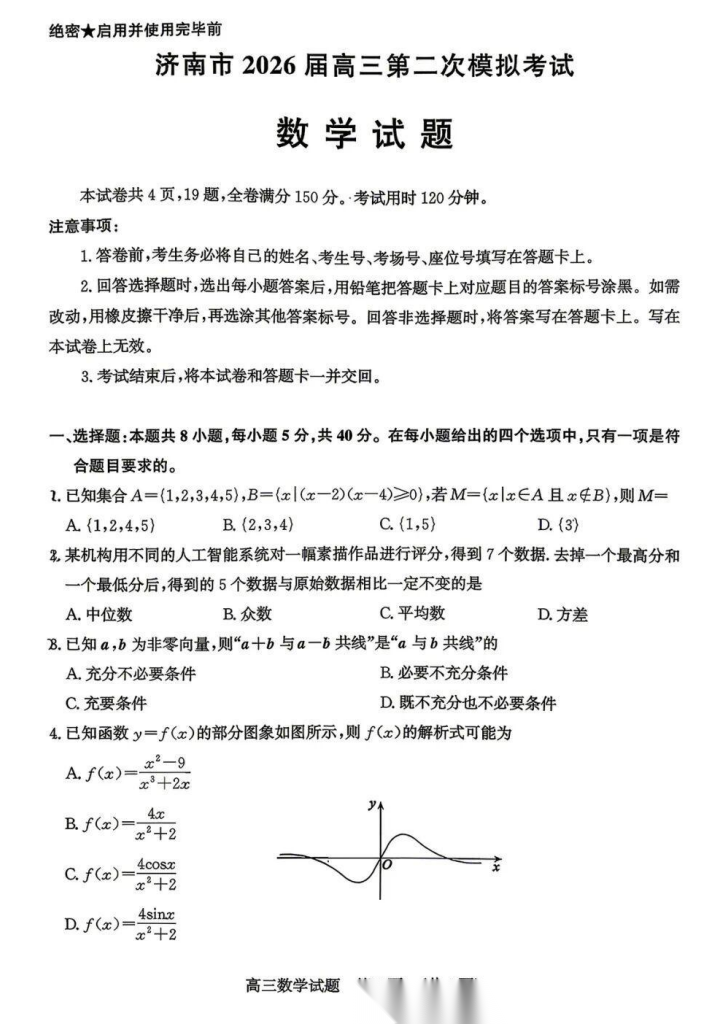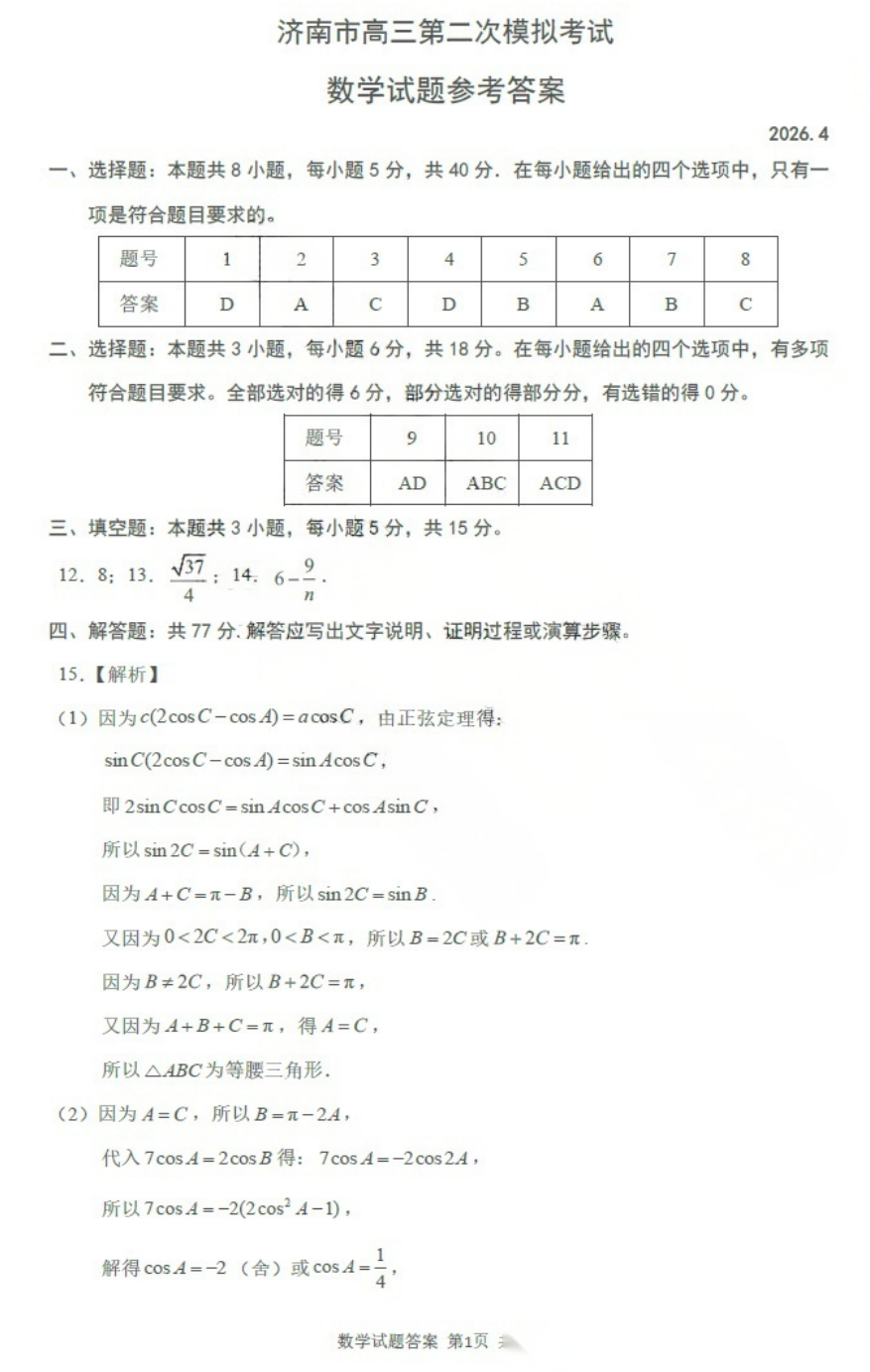 【山东卷】山东省济南市2026届高三年级第二次模拟考试(济南高三二模)(4.15-4.17) 数学语文试题卷+答案