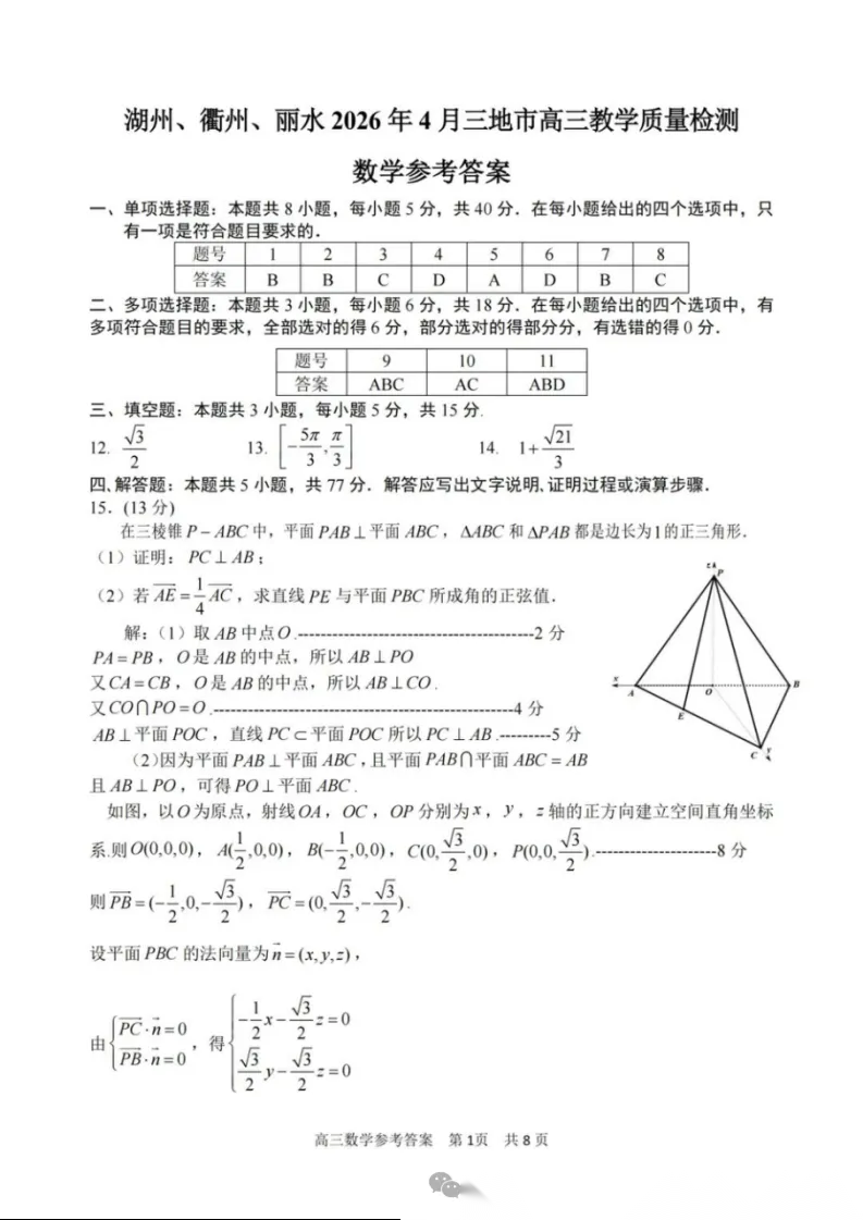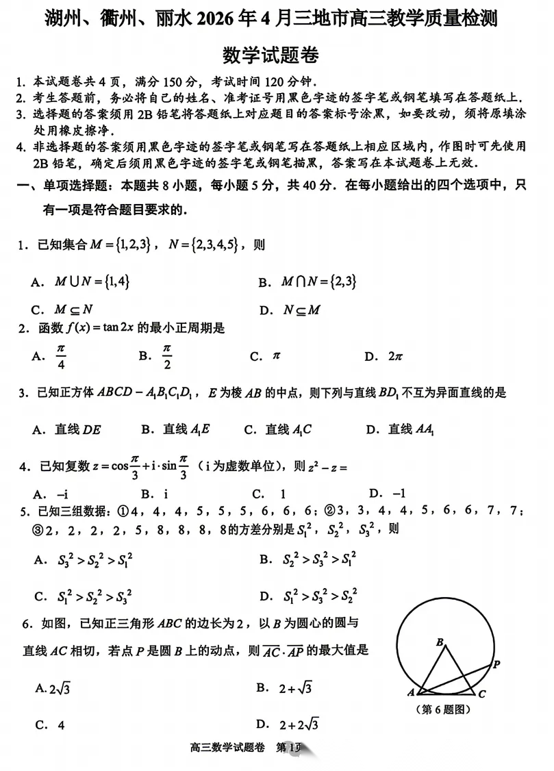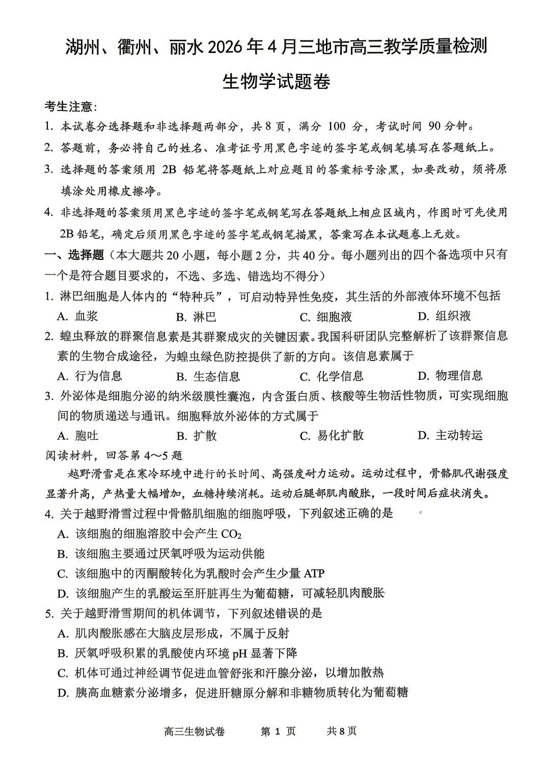 【浙江卷】浙江省湖州、丽水、衢州市2026年4月三地市高三年级教学质量检测(湖丽衢二模)(4.14-4.16) 数学生物英语语文历史地理试题卷+答案