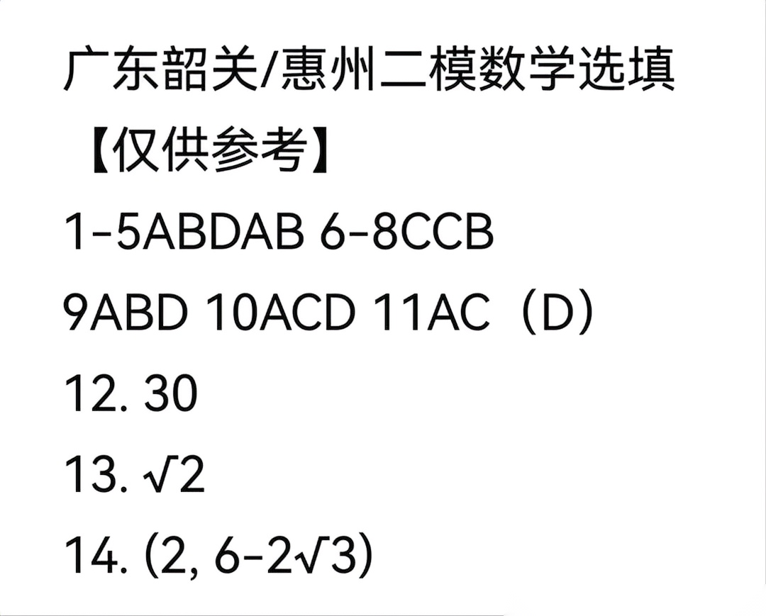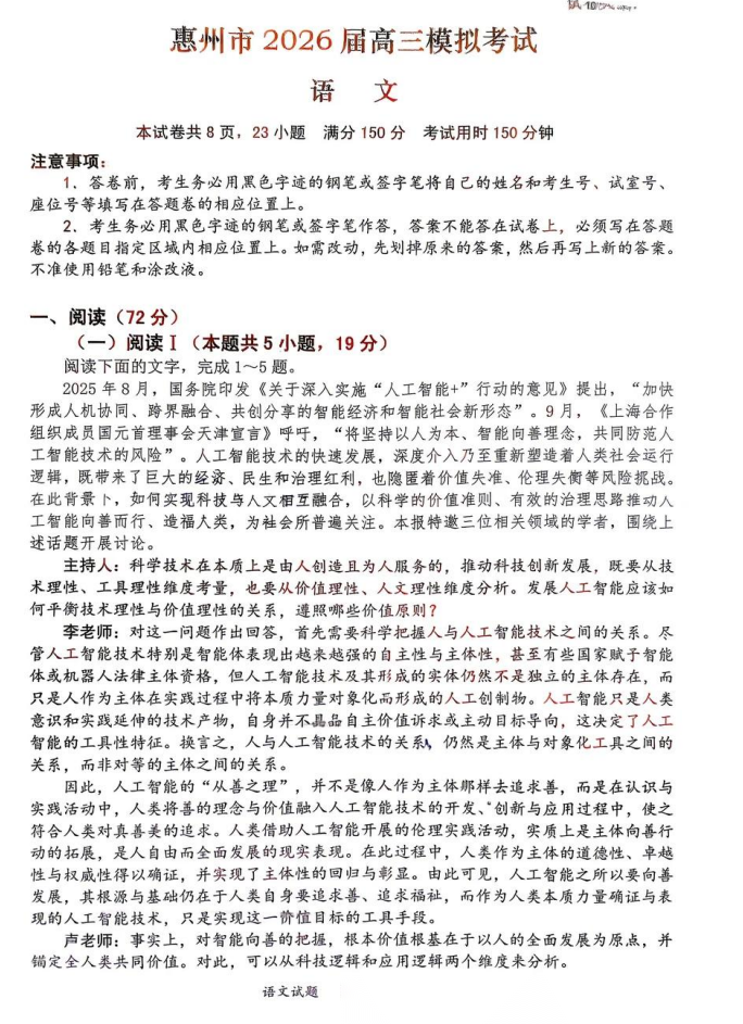 【广东卷】广东省惠州市、韶关市2026届高三年级4月模拟考试(惠州韶关统考同卷)(惠州韶关高三二模)(4.15-4.17) 数学语文试题卷+答案