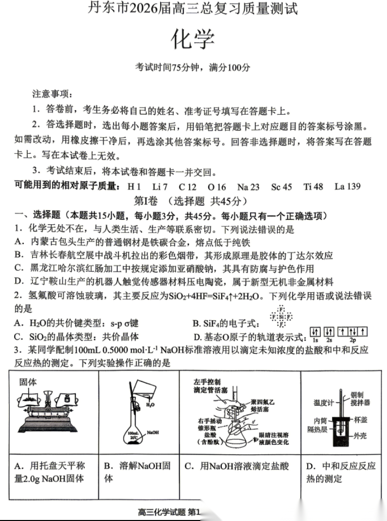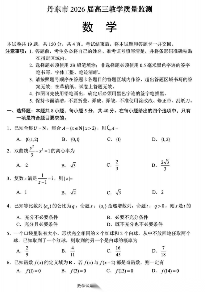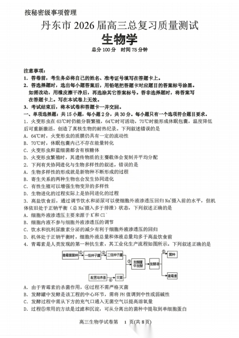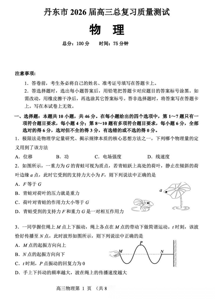 【黑吉辽蒙卷】辽宁省丹东市2026届高三年级教学质量监测(丹东高三一模)(4.7-4.9) 全科试题卷(缺英语)+答案