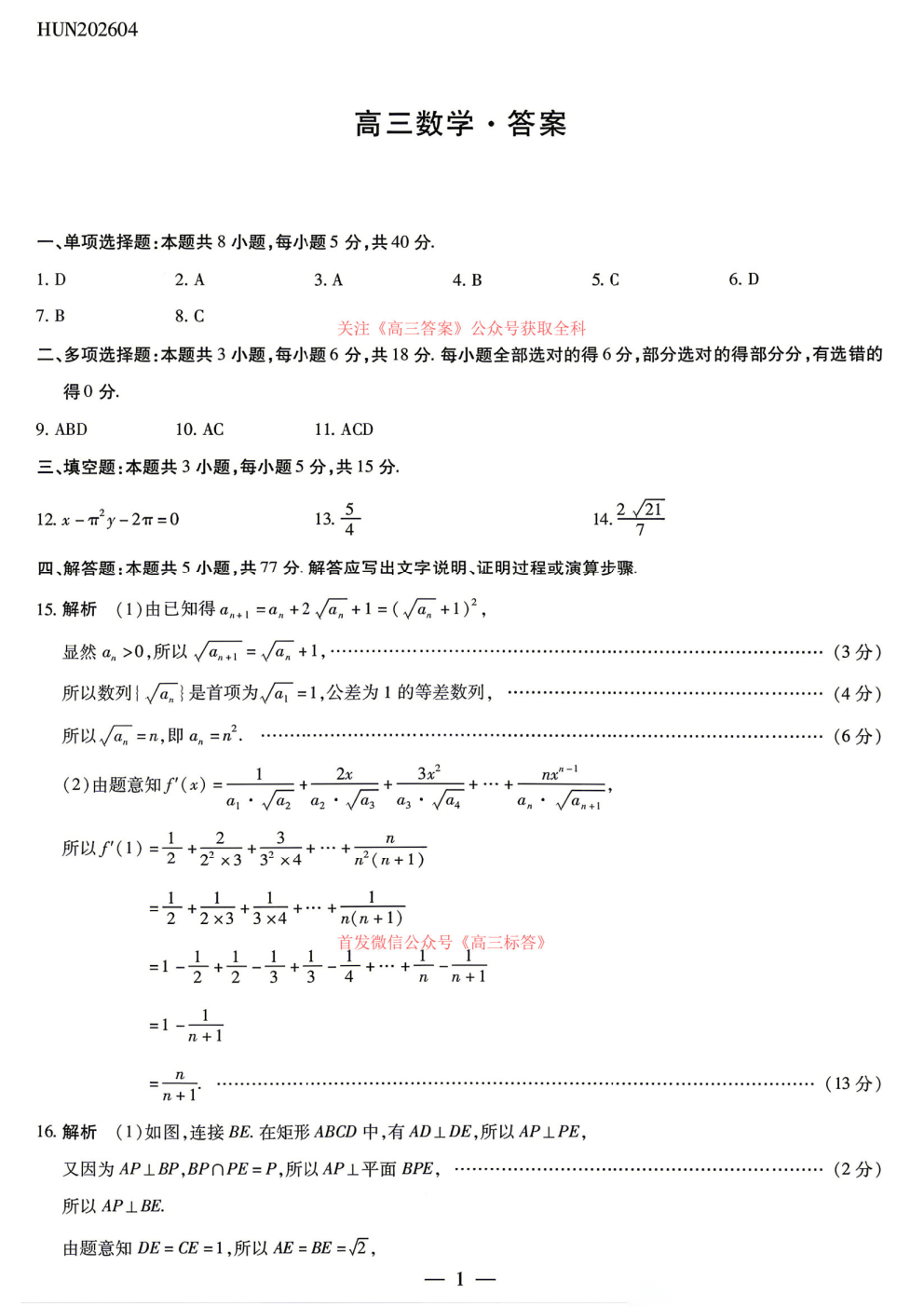2026湖南、广西高三4月16联考答案