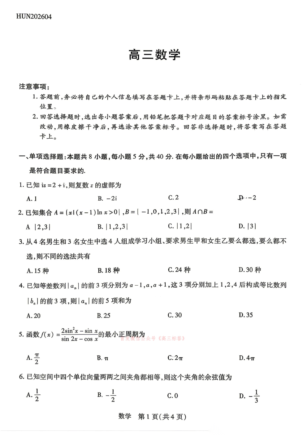 皖南八校2026届高三4月教学质量检测答案 皖南八校2026届高三4月教学质量检测答案