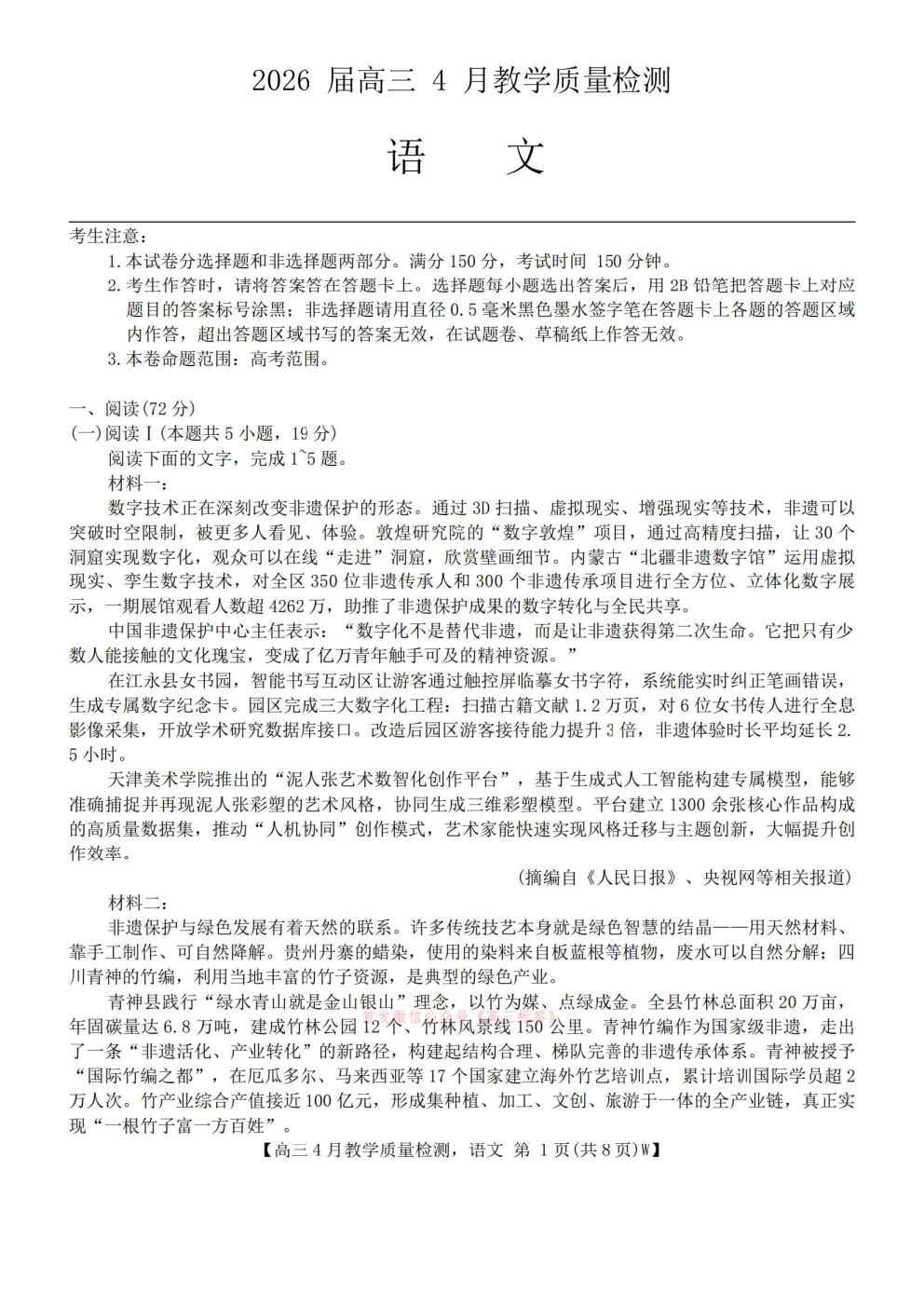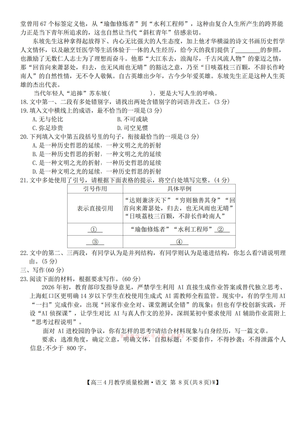 皖南八校2026届高三4月教学质量检测答案 皖南八校2026届高三4月教学质量检测答案