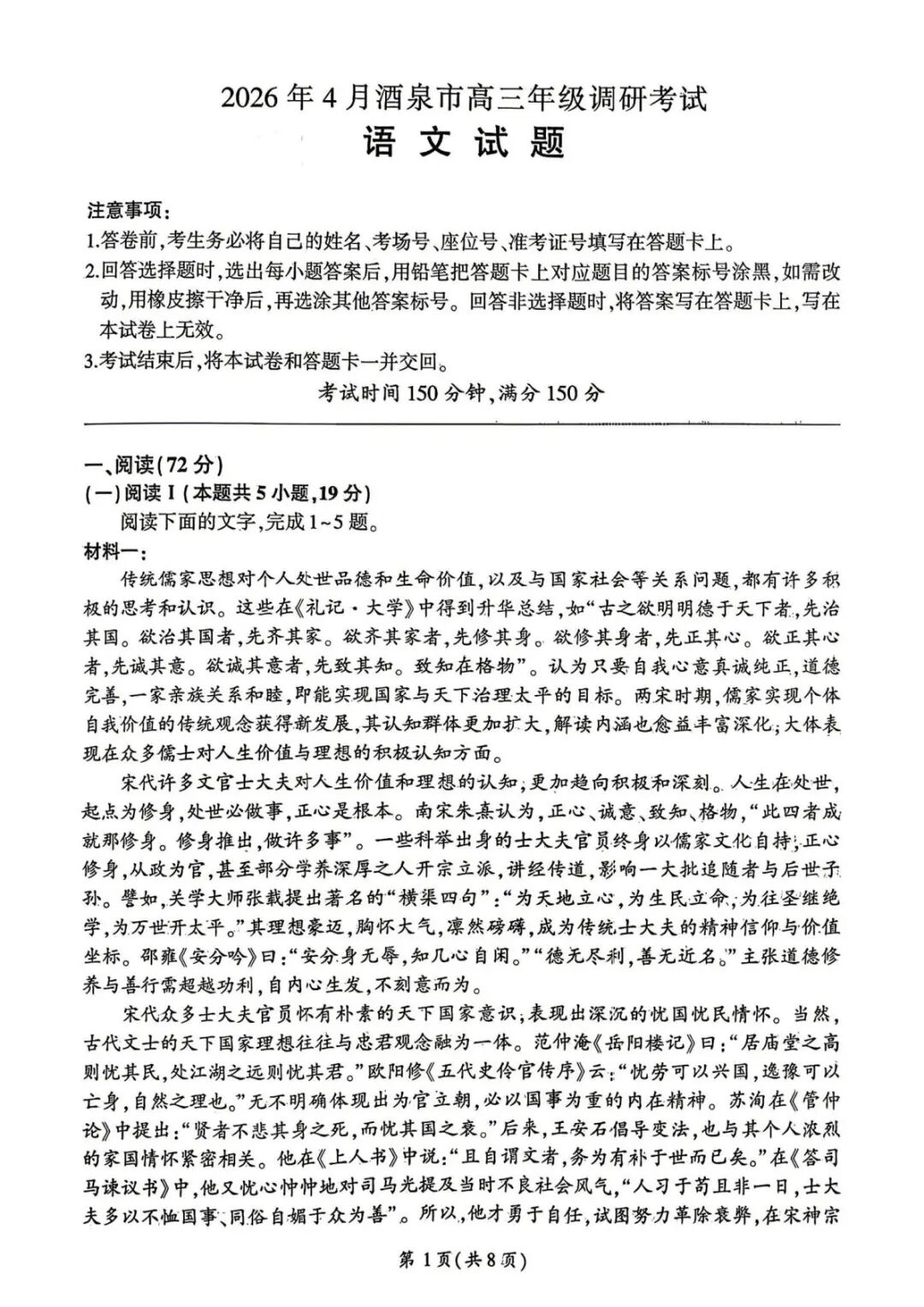 2026年4月甘肃酒泉高三年级调研考试