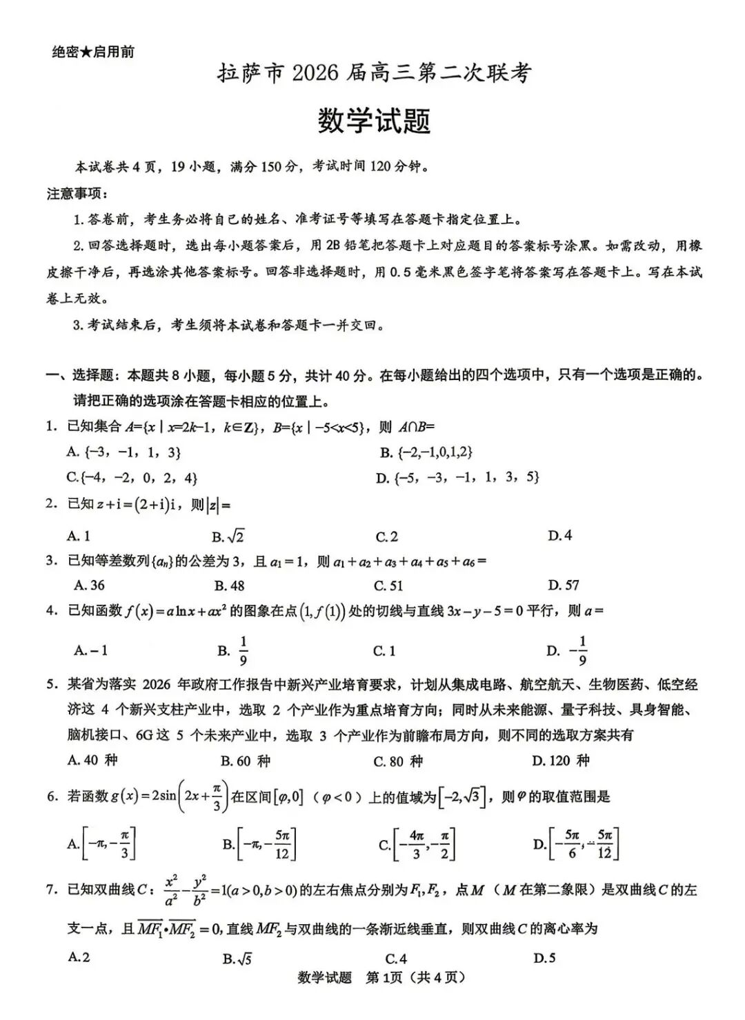 2026年西藏拉萨高三二模第二次联考【拉萨二模】