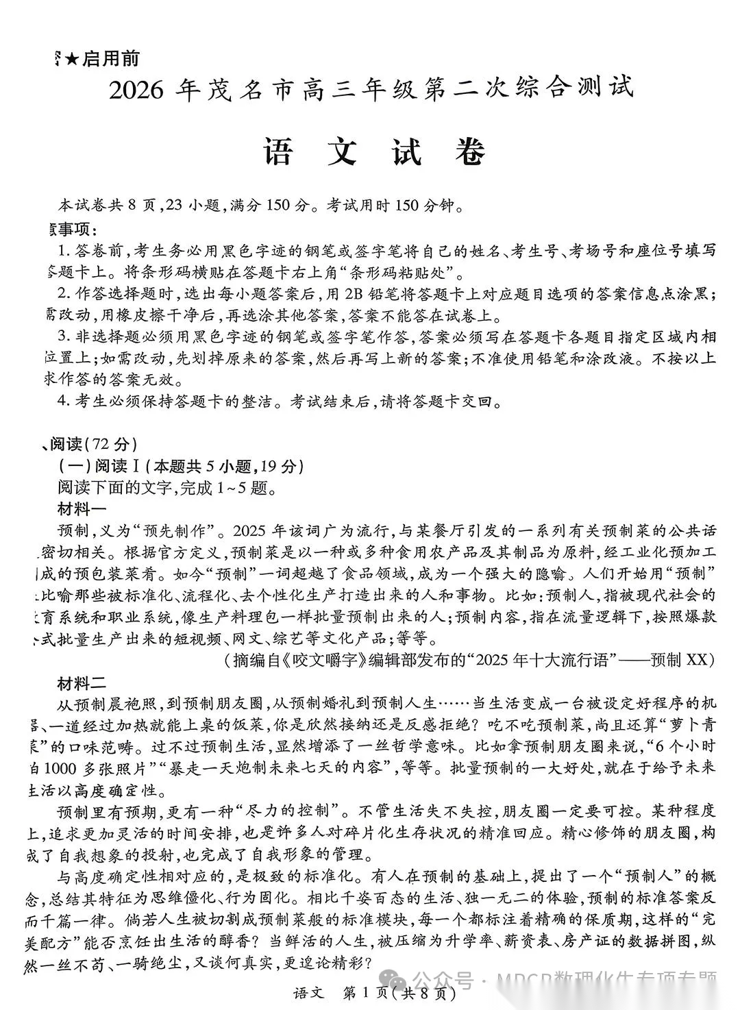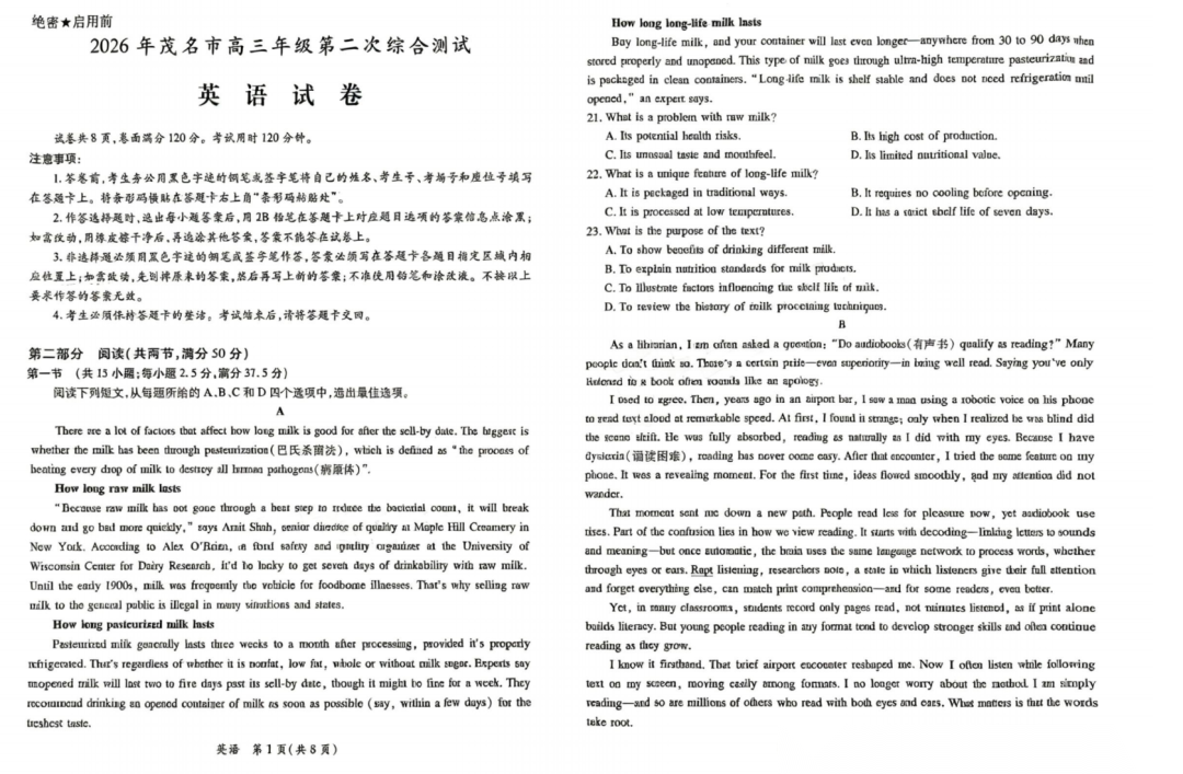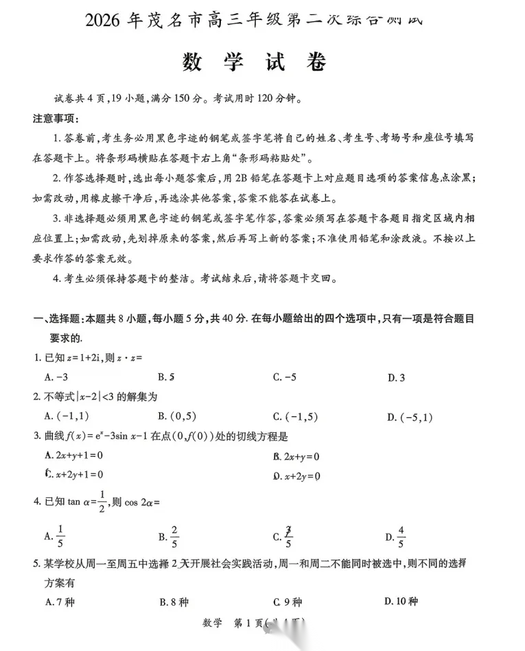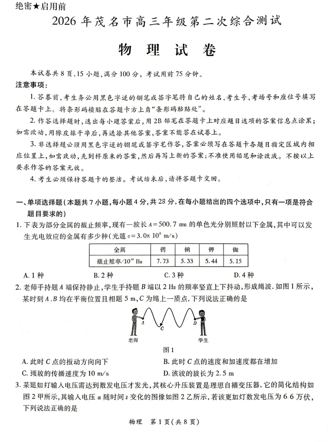 【广东卷】广东省茂名市2026年茂名市高三年级第二次综合测试(茂名高三二模)(4.15-4.17) 数学物理英语语文历史试题卷+答案