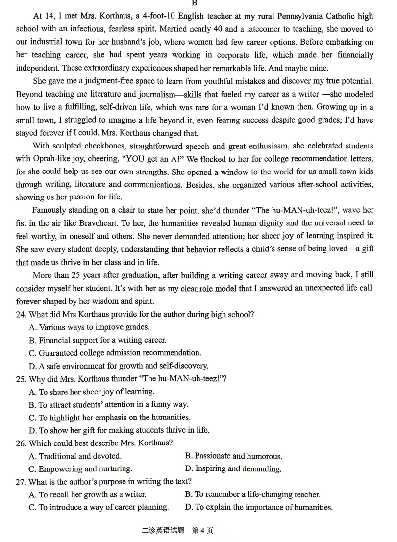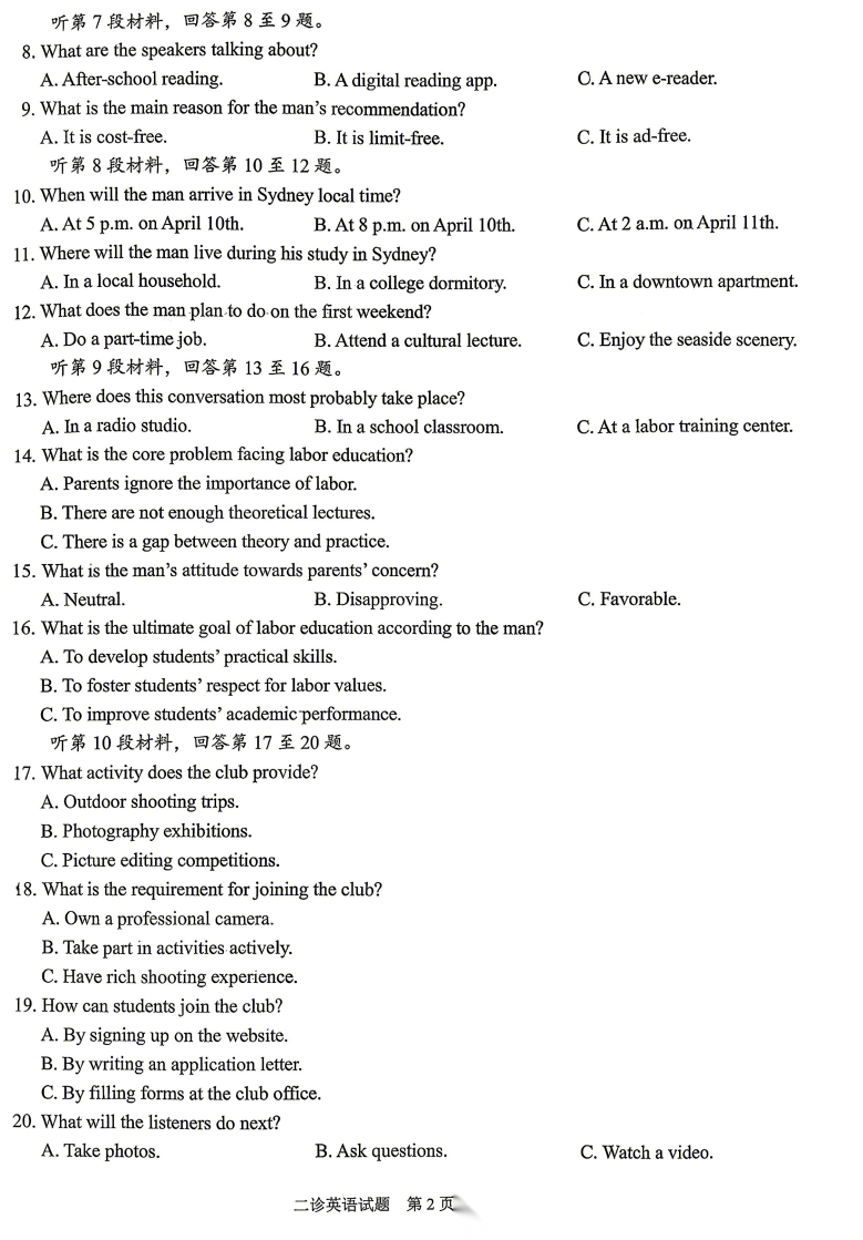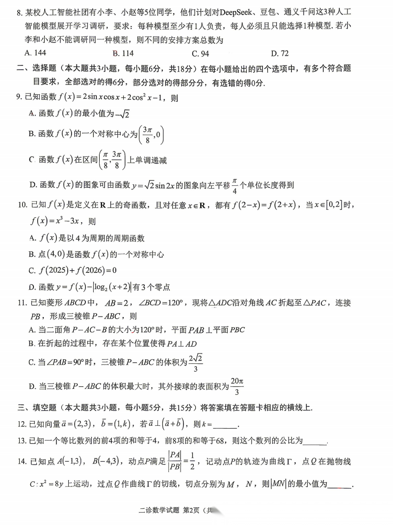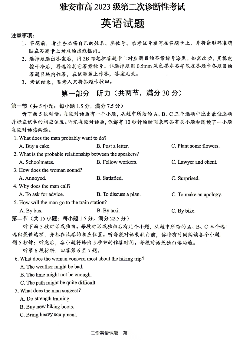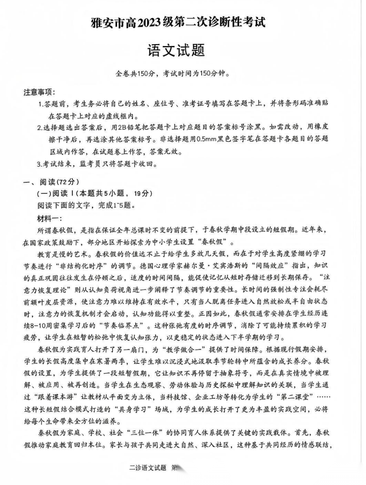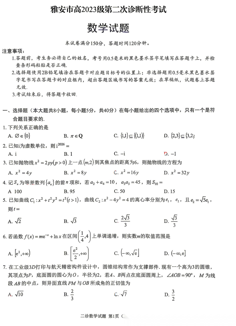 【四川卷】四川省雅安市2023级(2026届)高三年级第二次诊断性考试(雅安二诊)(4.8-4.10) 全科试题卷+答案