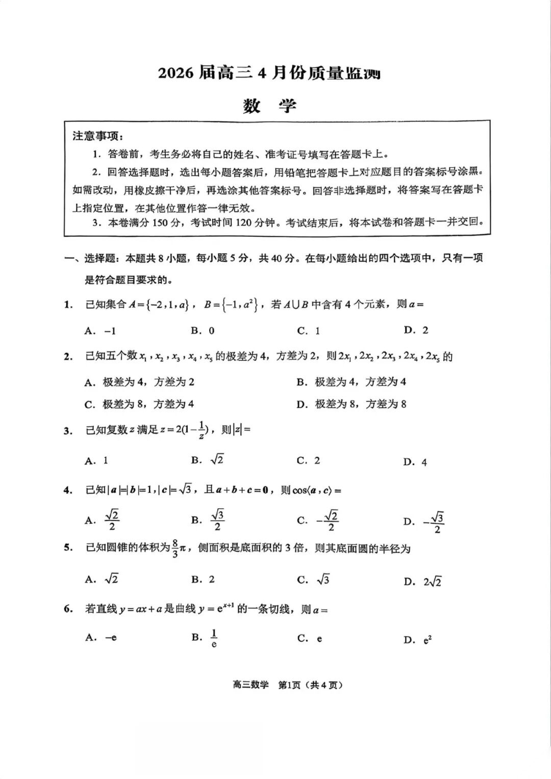 【江苏卷】江苏省南通市基地学校大联考2026届高三年级4月份质量监测(4.16-4.17) 数学语文试题卷+答案 【江苏卷】江苏省南通市基地学校大联考2026届高三年级4月份质量监测(4.16-4.17) 数学语文试题卷+答案