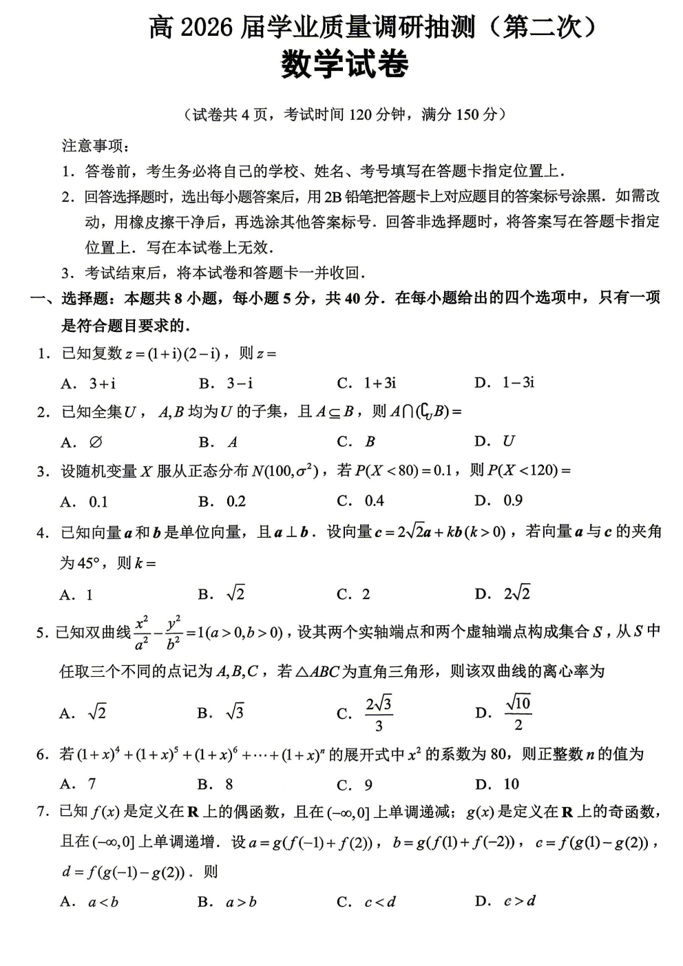 重庆高2026届第二次学业质量调研抽测全科下载