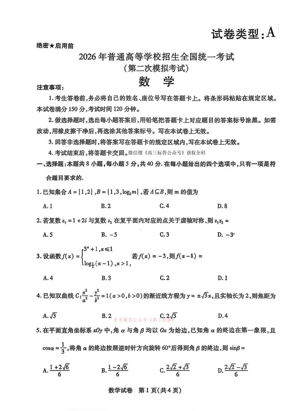 2026年普通高校招生考试冲刺压轴卷一答案 2026年普通高校招生考试冲刺压轴卷一答案