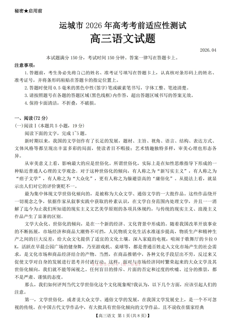 【运城二模】运城市2026年4月高考考前适应性测试全科下载