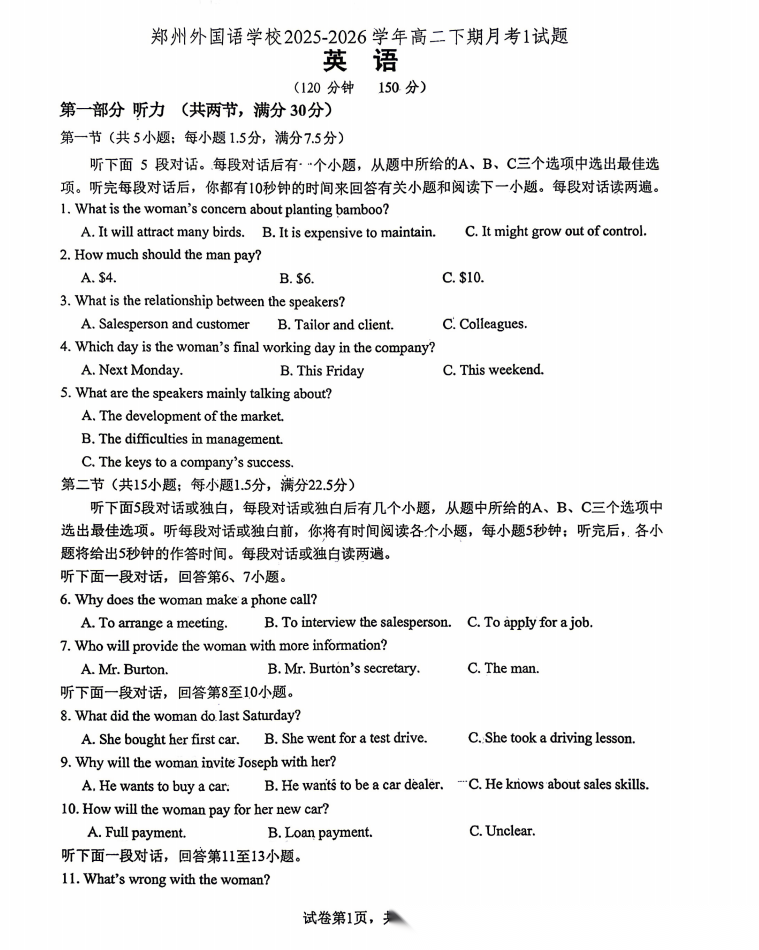 【Top15强校】【河南卷】【高二】河南省郑州外国语学校2025-2026学年高二年级学期月考1(第一次月考)(3月底)数学物理化学英语试题卷+答案