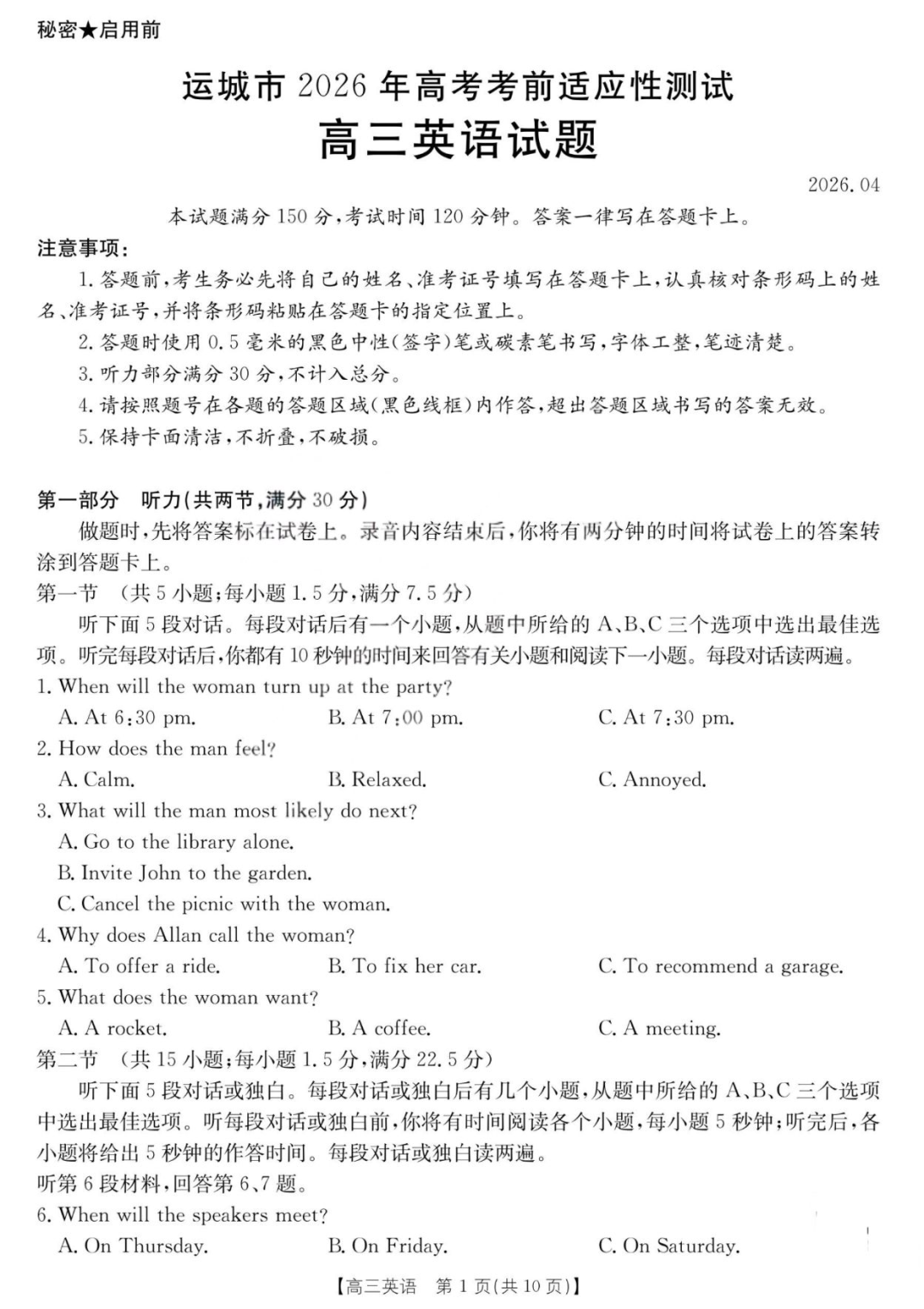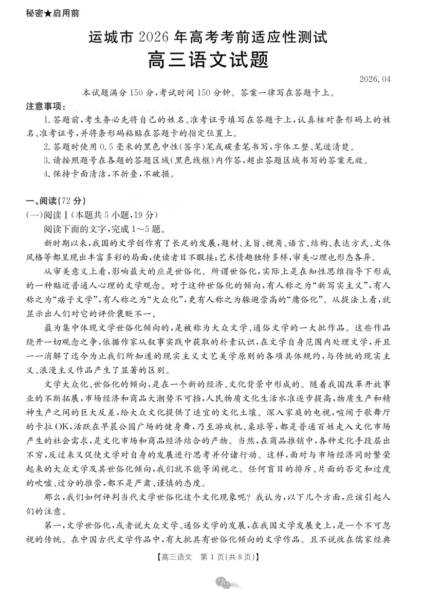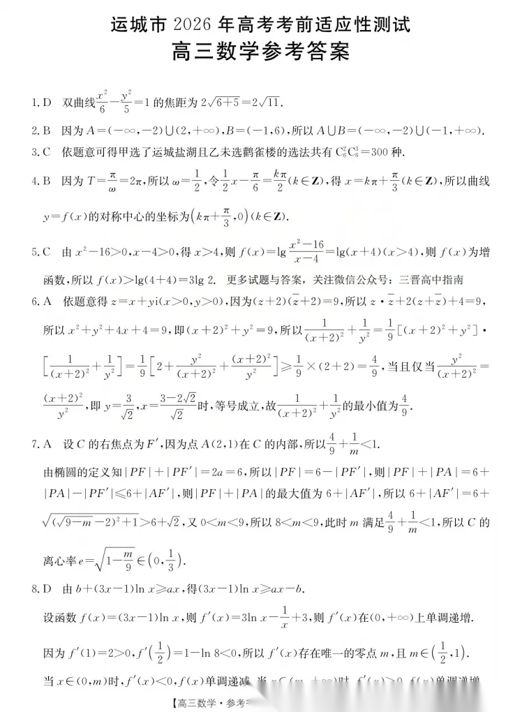 【西北卷】【山西卷】山西省运城市 2026年高三年级高考考前适应性测试(运城二模)(4.15-4.17) 全科题卷+答案