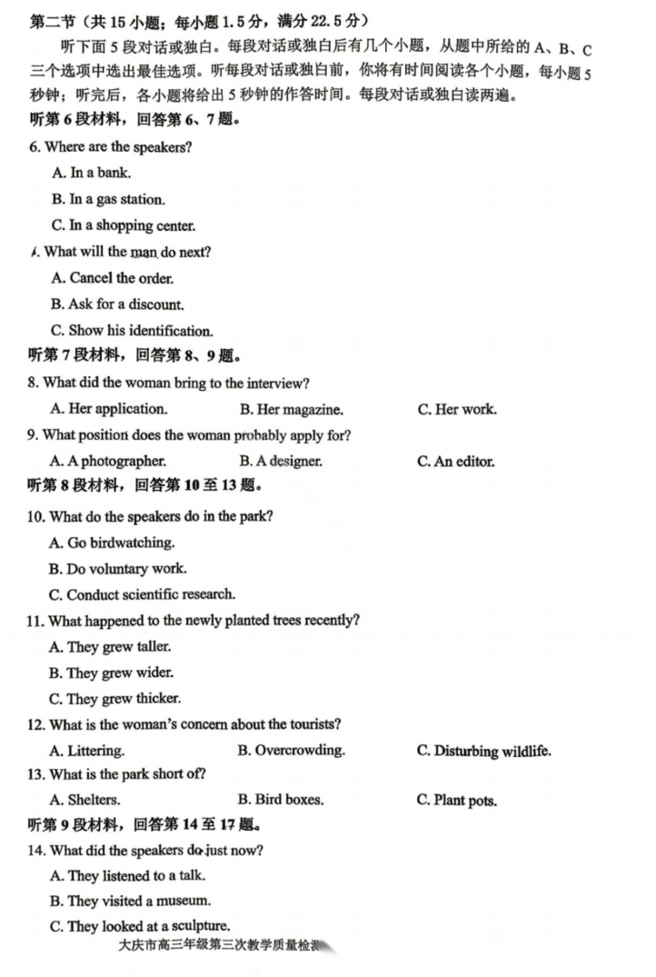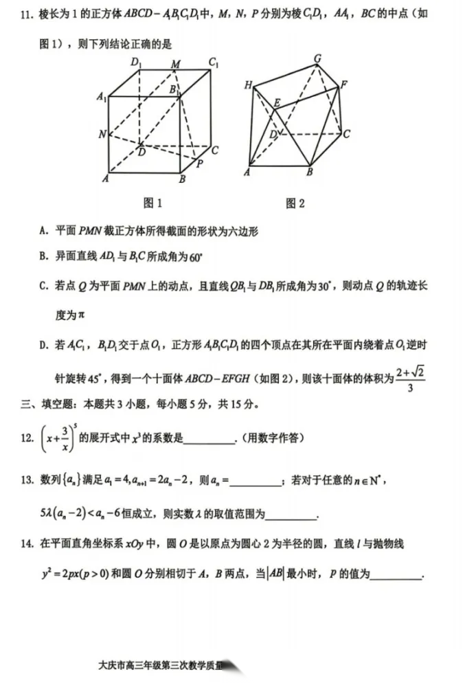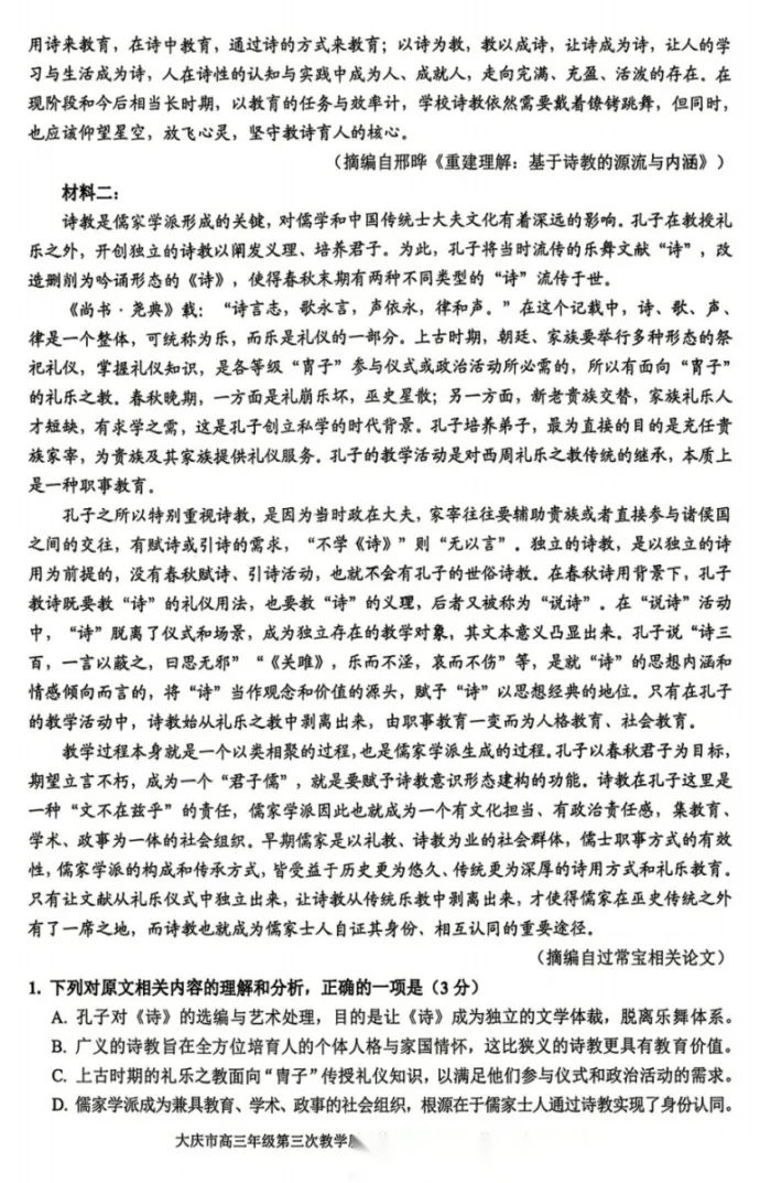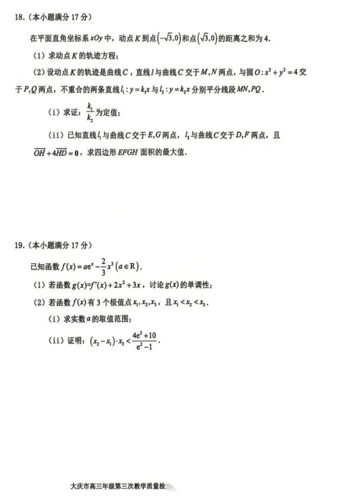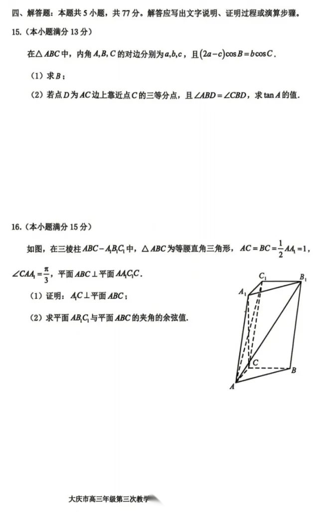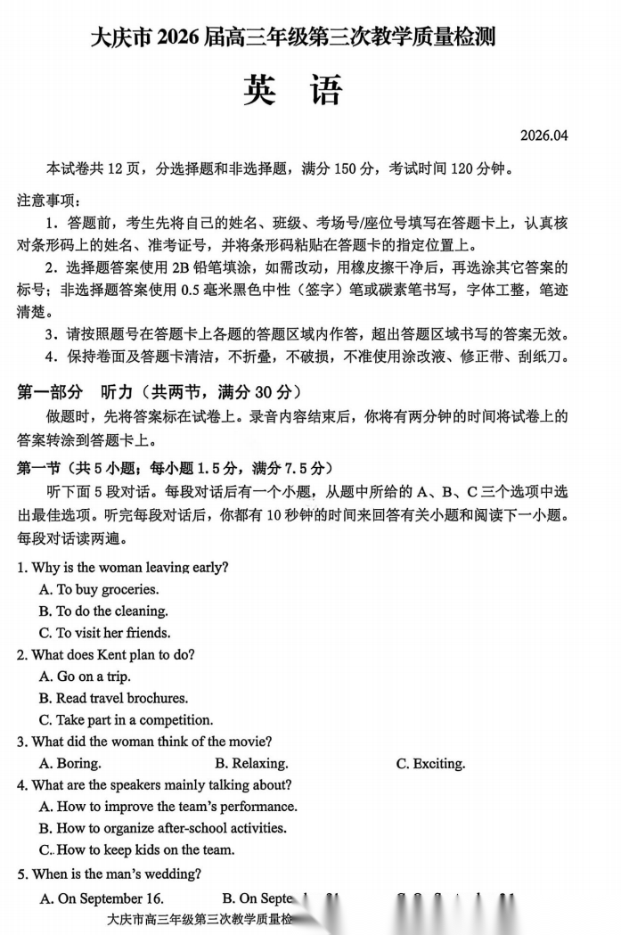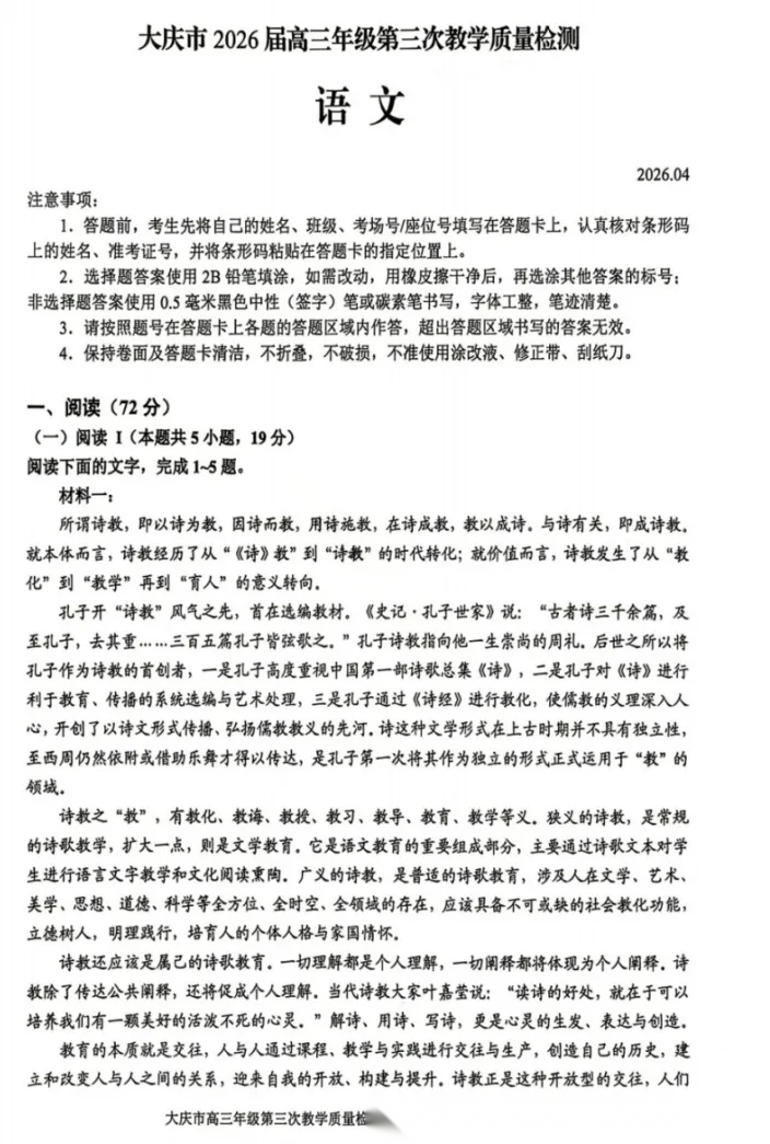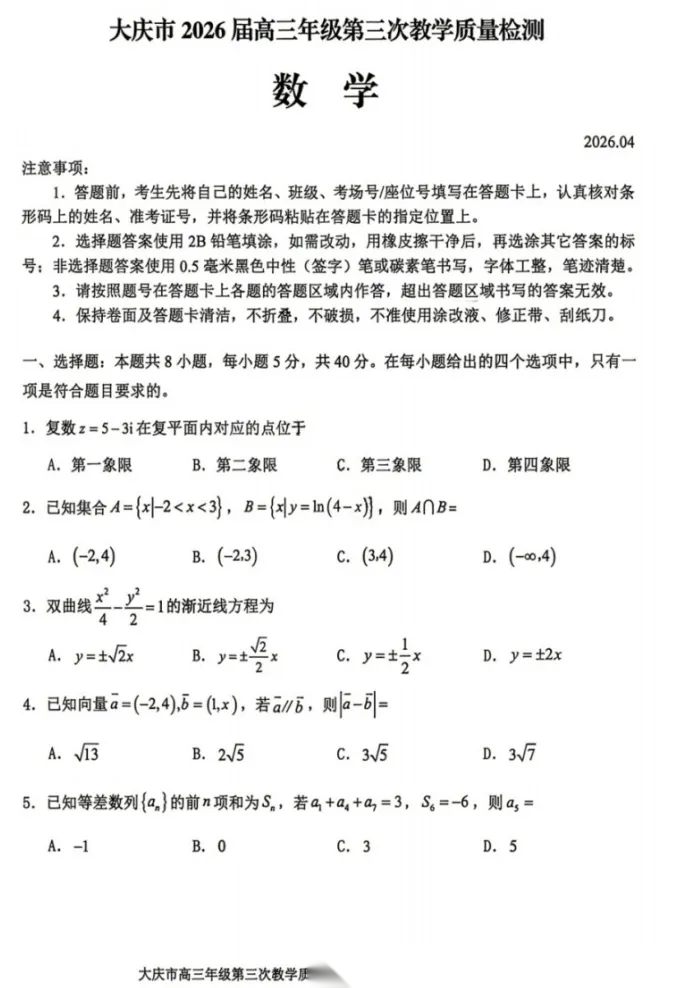 【黑吉辽蒙卷】黑龙江省大庆市2026届高三年级第三次教学质量检测(大庆三模)(4.15-4.17) 全科试题卷+答案