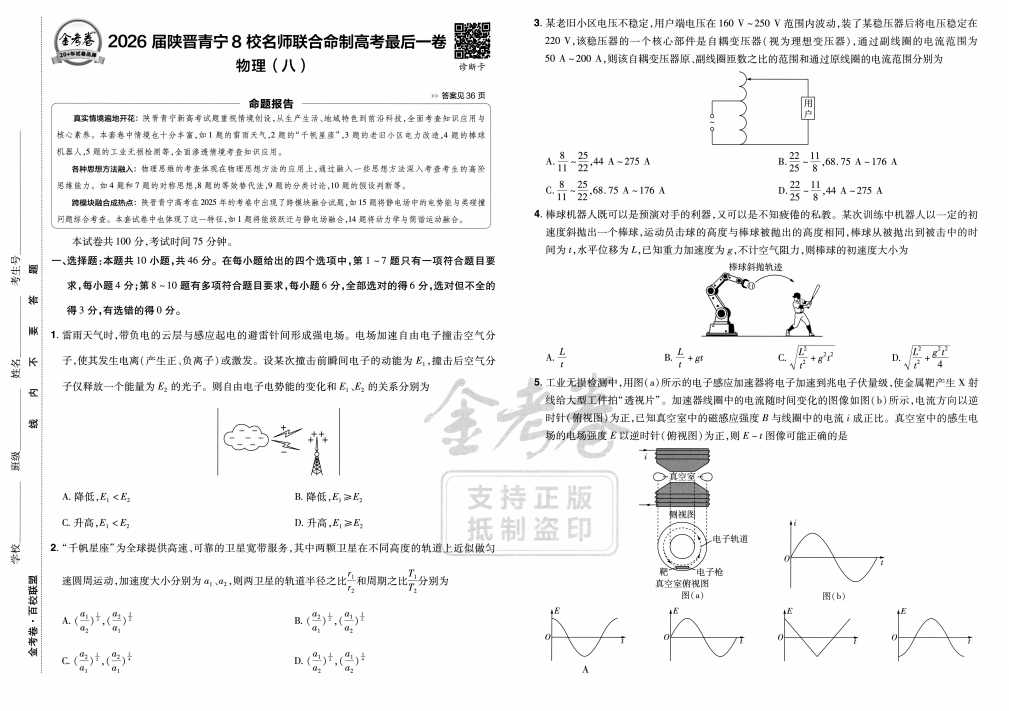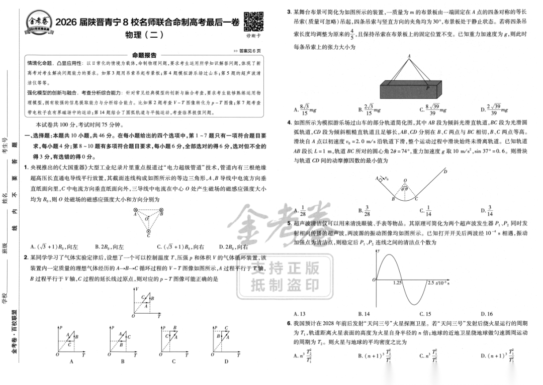 【高考物理】【最后一卷】陕甘青宁晋2026高考物理最后一卷--8省名师独家命制,固定高考命题点----物理试题卷+规范答题6维解析册(完整版)