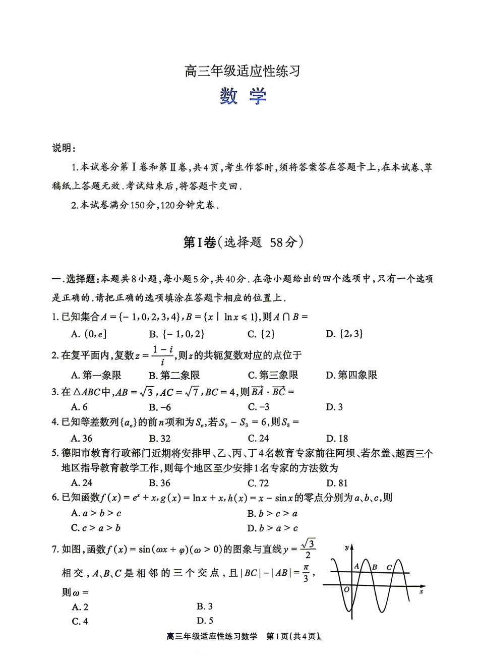 【绵阳三诊】四川省高三年级4月适应性练习答案