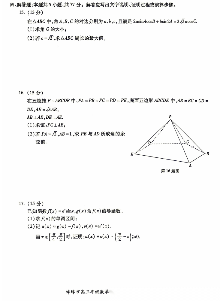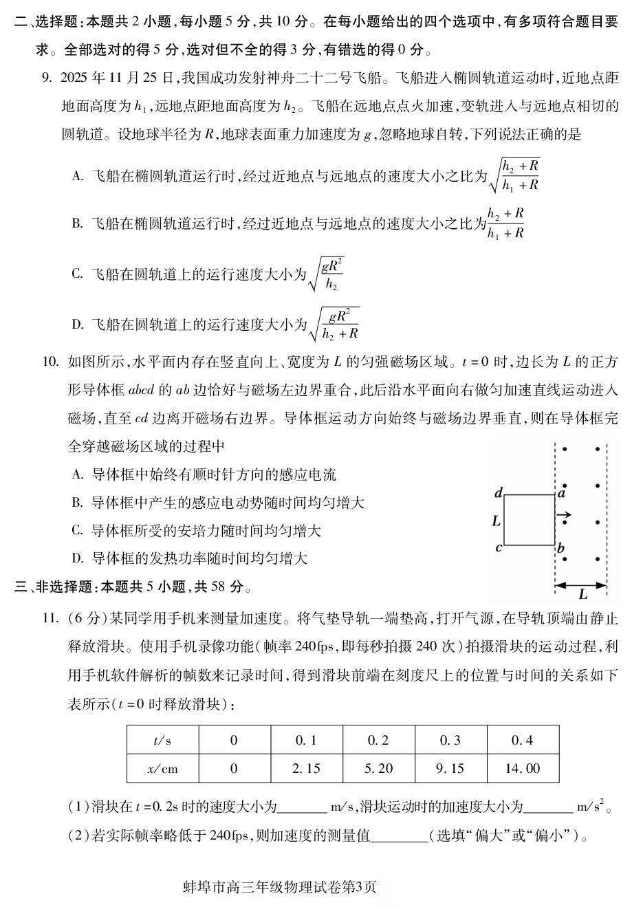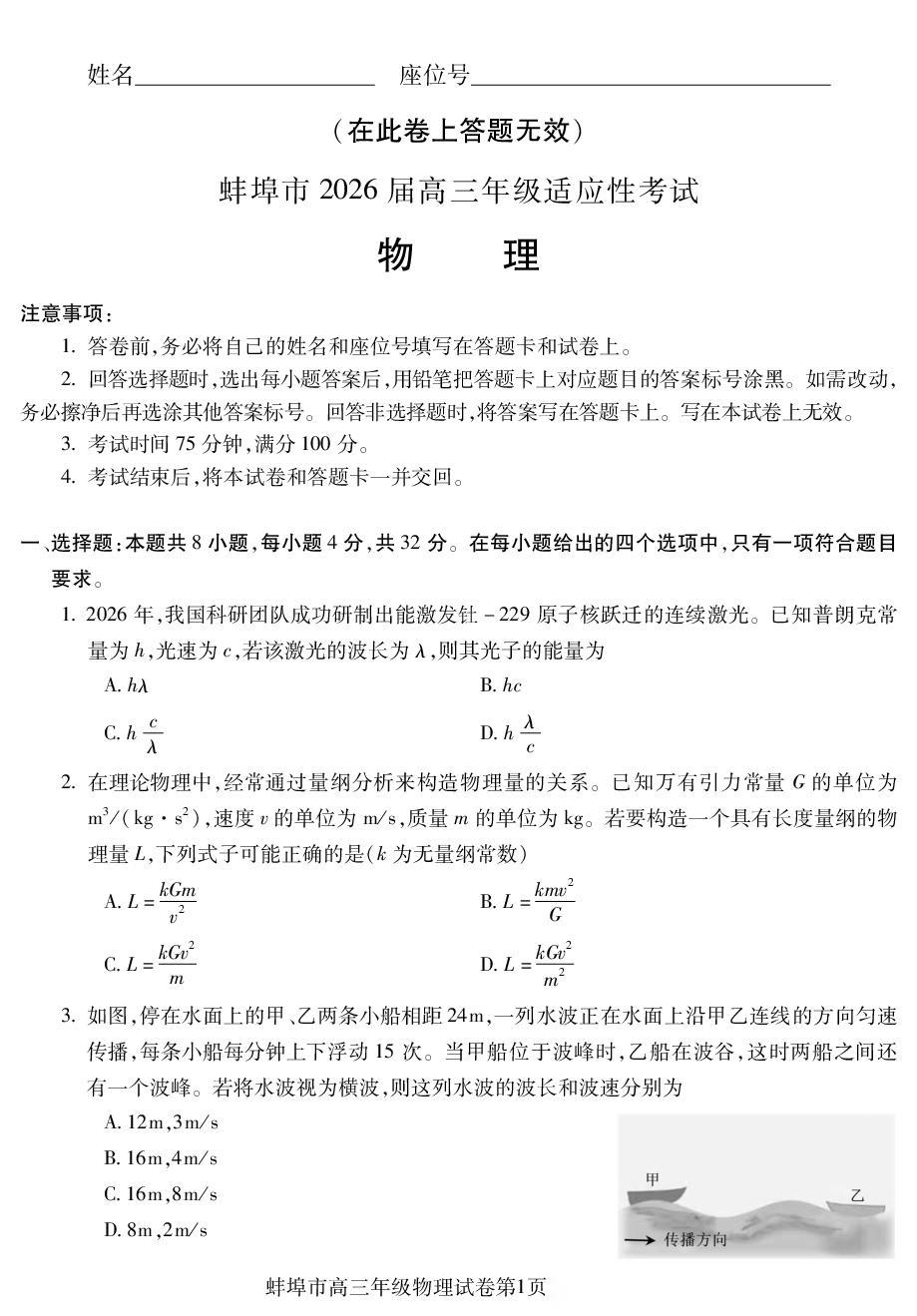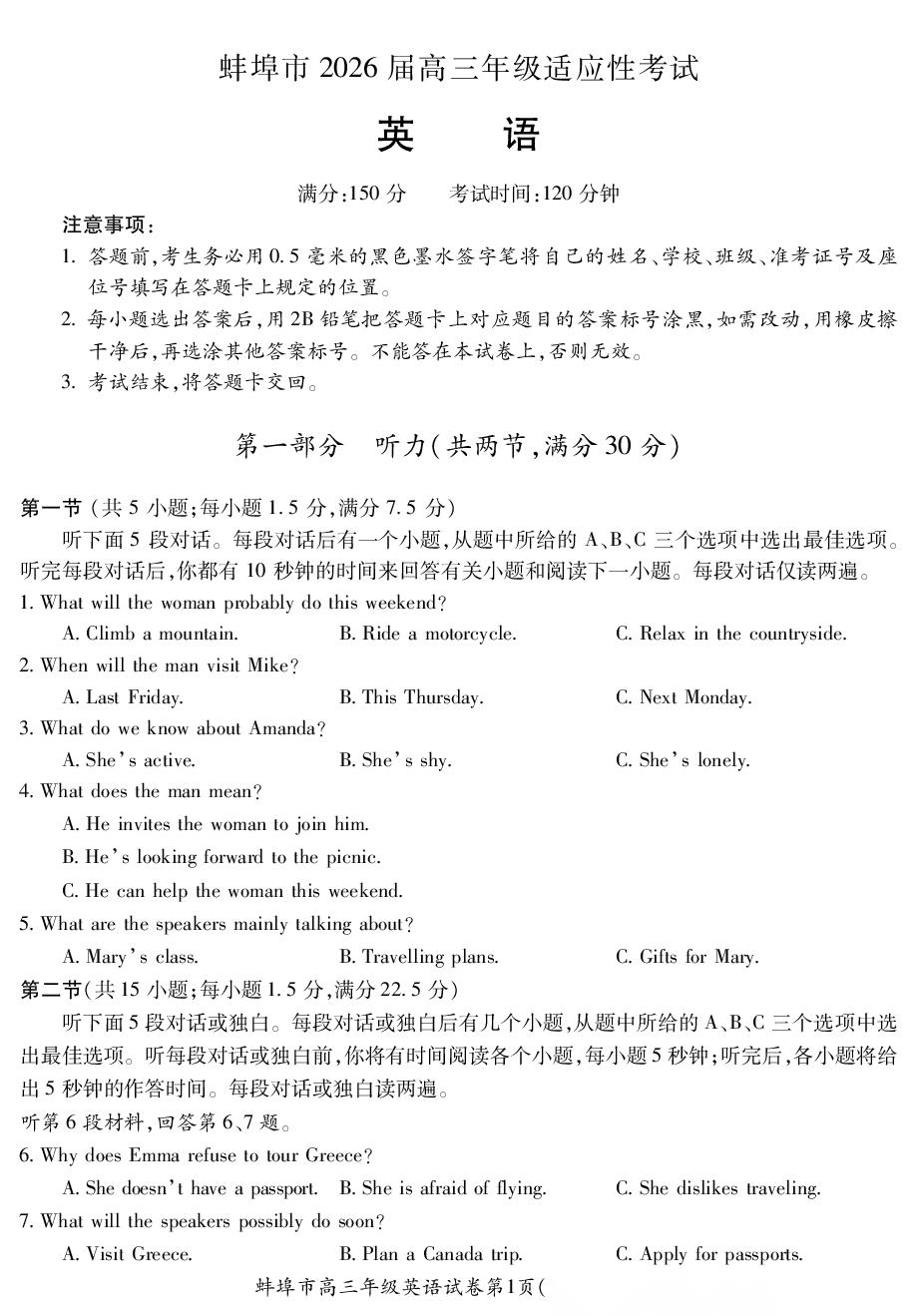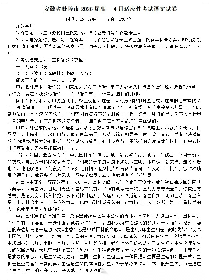 【安徽卷】安徽省蚌埠市2026届高三下学期4月适应性考试(蚌埠高三二检(二模))(4.19-4.21) 数学物理英语语文历史试题卷+答案