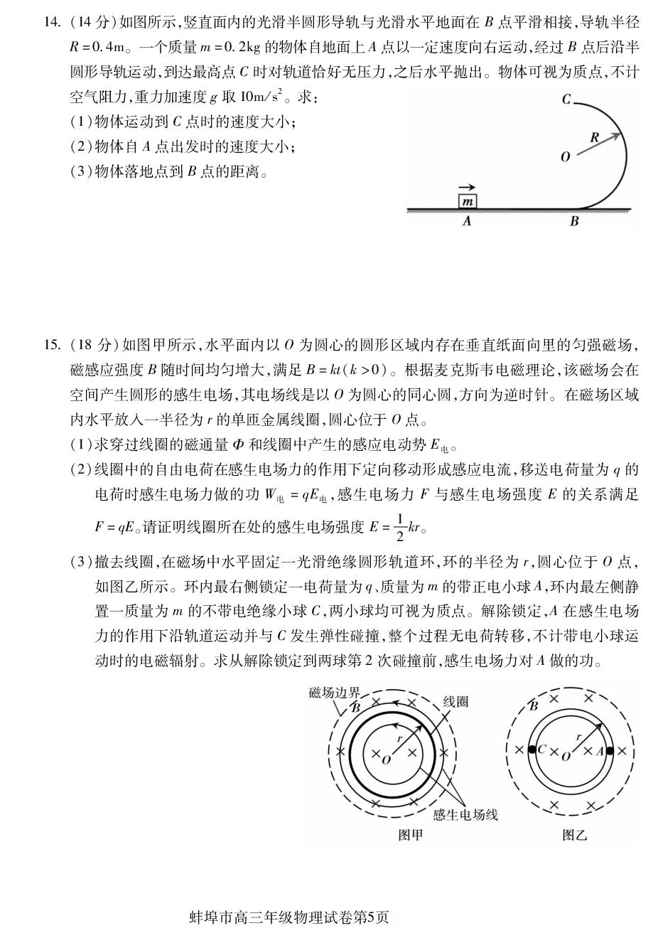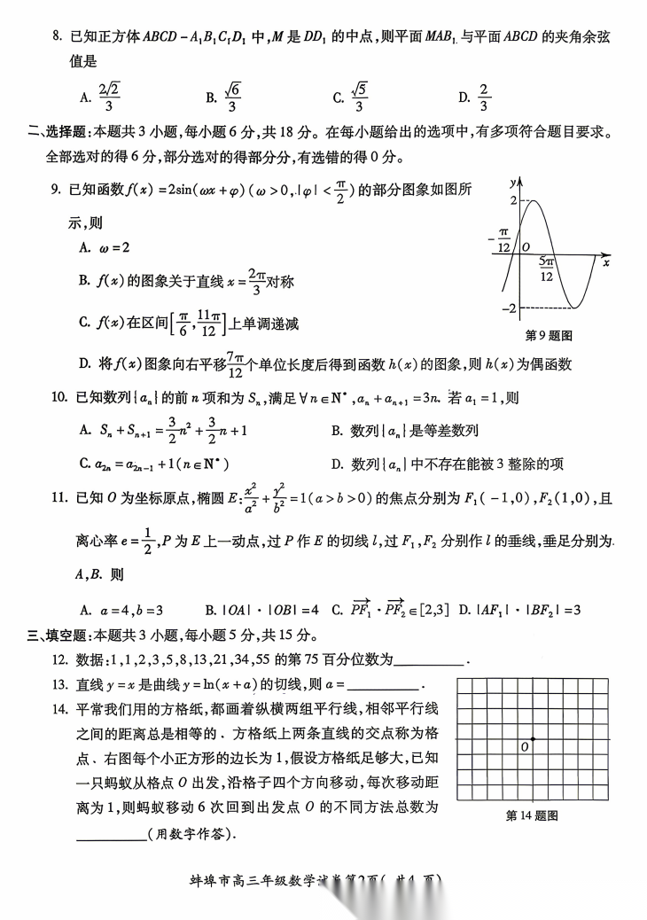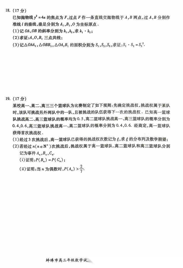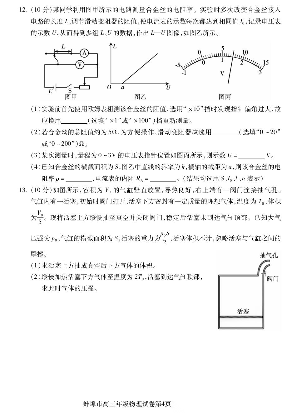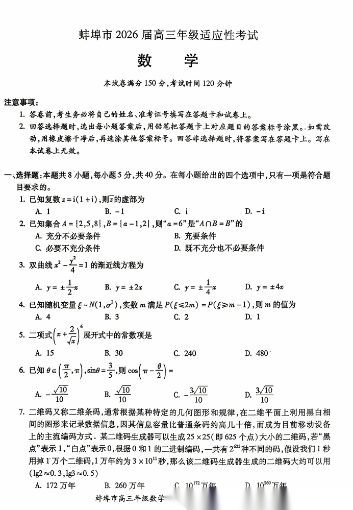 【安徽卷】安徽省蚌埠市2026届高三下学期4月适应性考试(蚌埠高三二检(二模))(4.19-4.21) 数学物理英语语文历史试题卷+答案