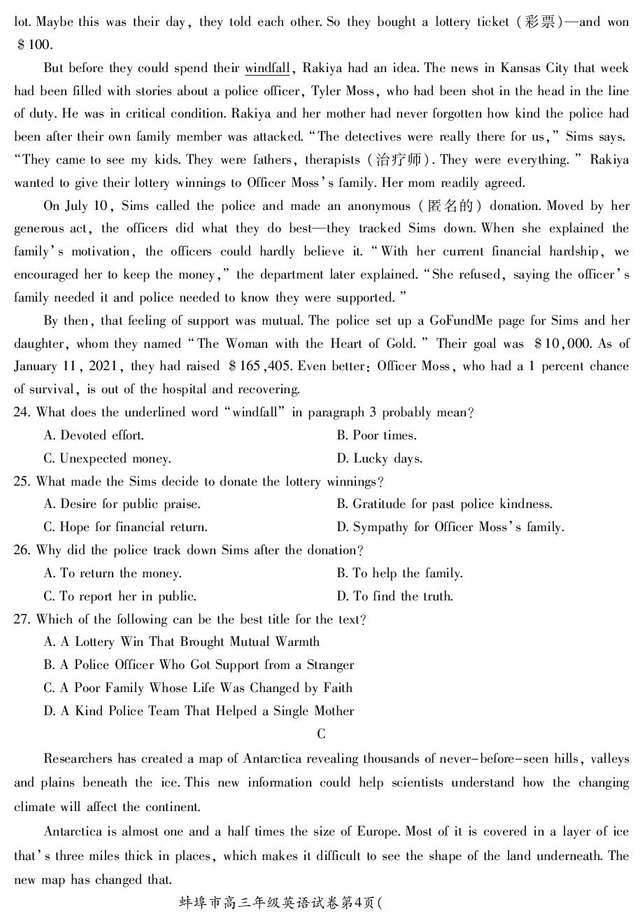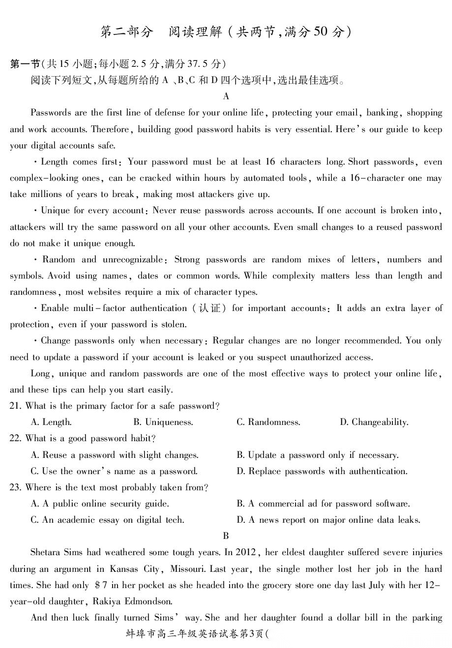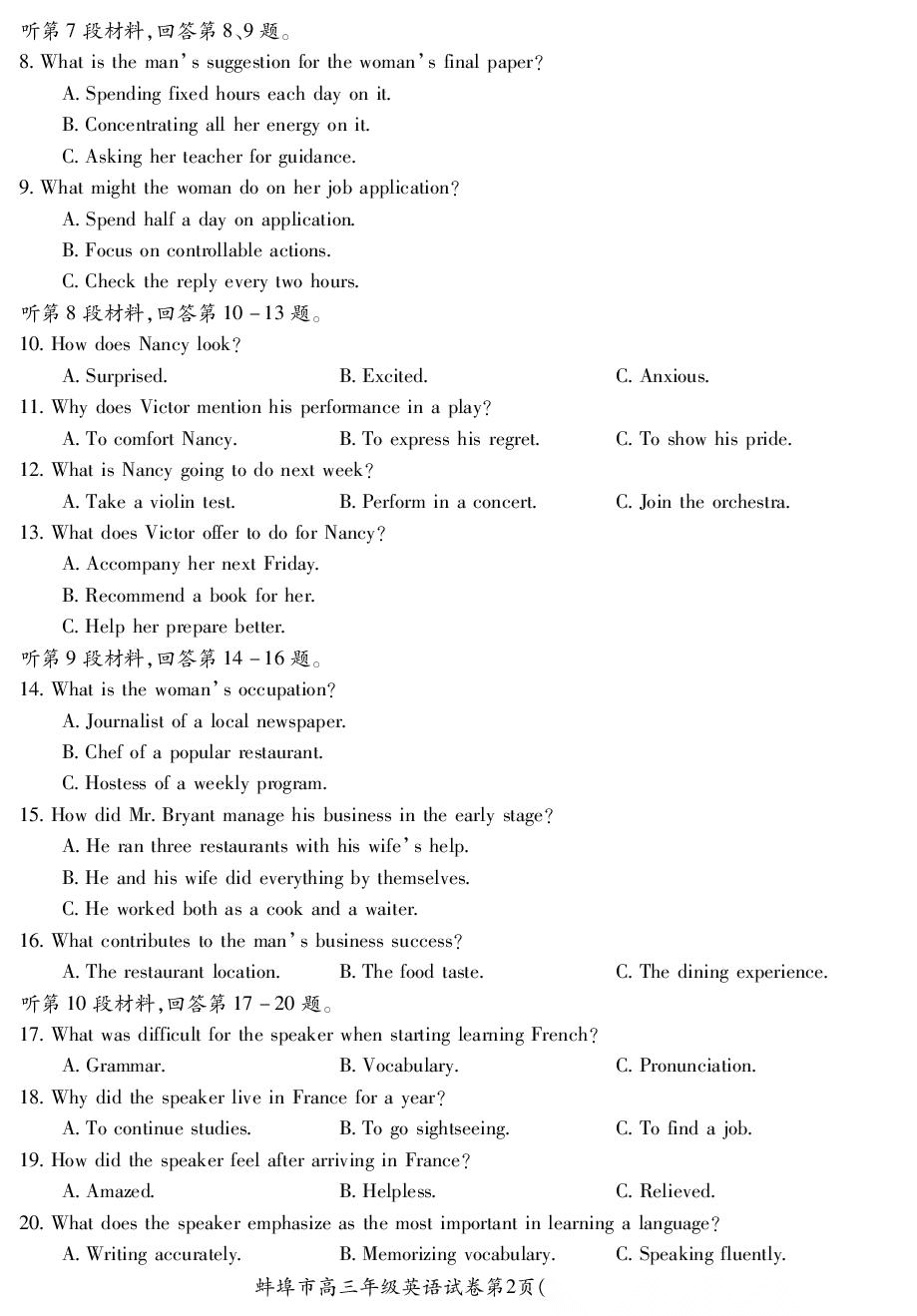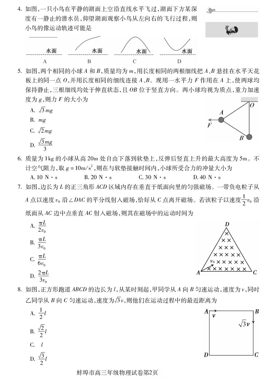 【安徽卷】安徽省蚌埠市2026届高三下学期4月适应性考试(蚌埠高三二检(二模))(4.19-4.21) 数学物理英语语文历史试题卷+答案