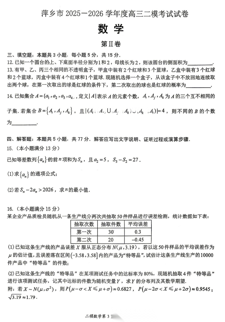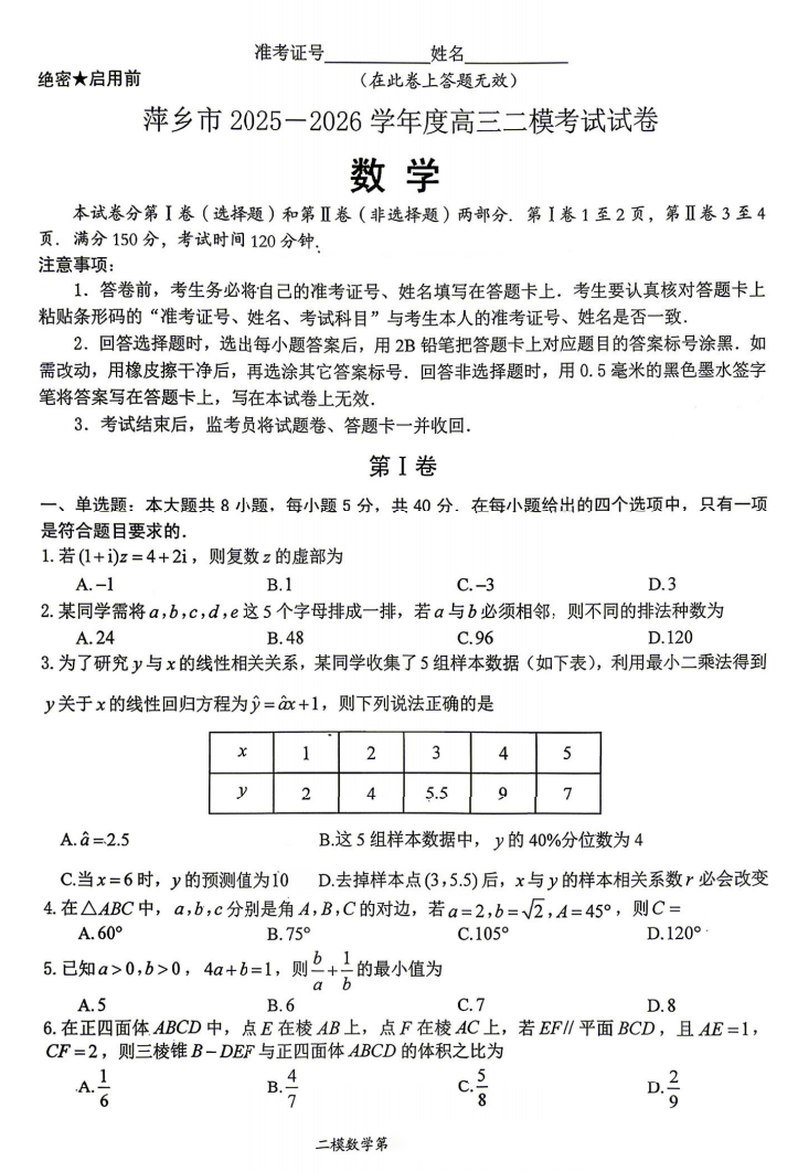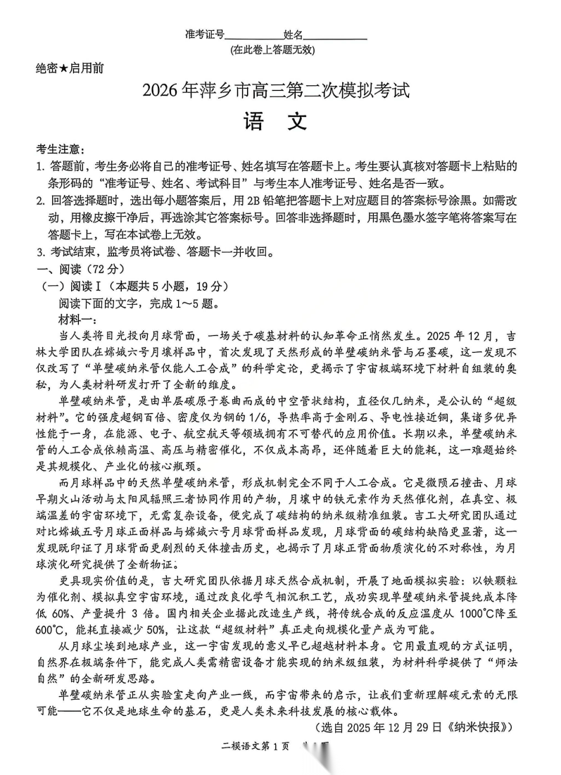 【江西卷】江西省萍乡市2026年萍乡市高三年级第二次模拟考试(萍乡二模)(4.20-4.21) 数学语文试题卷+答案