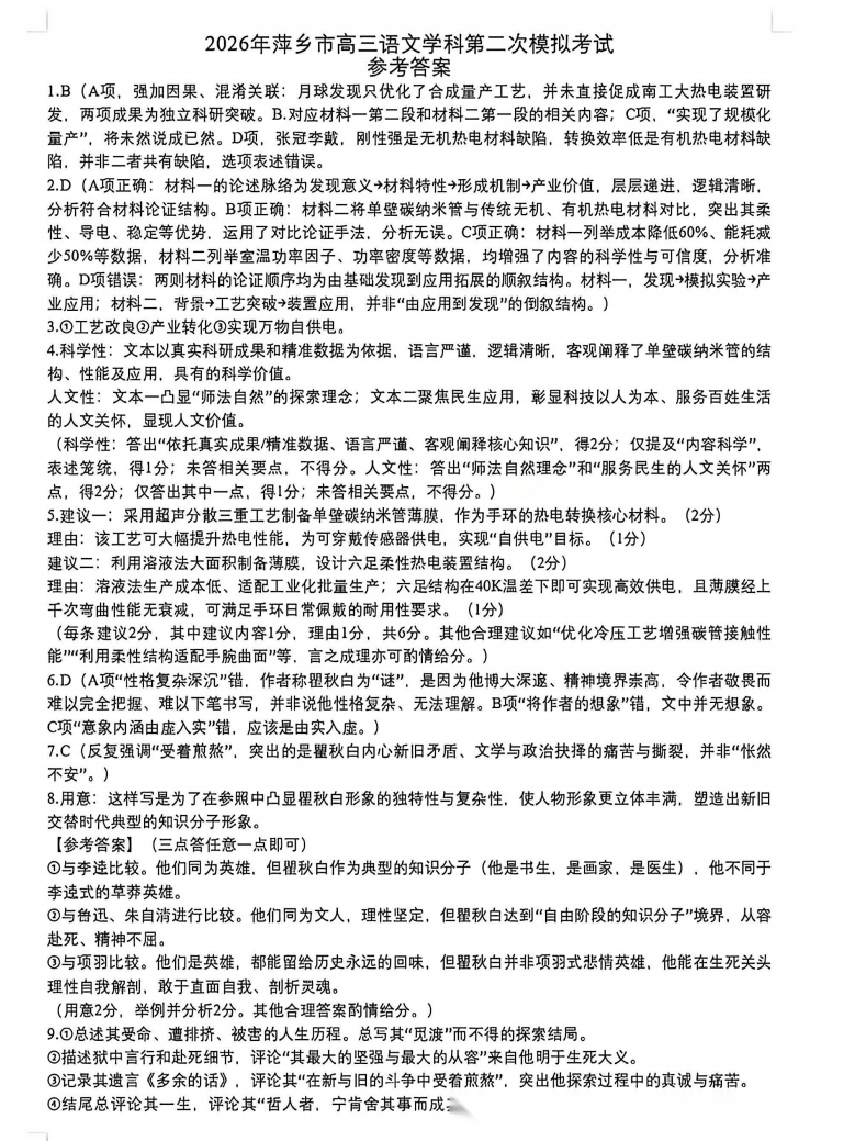 萍乡市2025-2026学年度高三二模考试答案 萍乡市2025-2026学年度高三二模考试答案