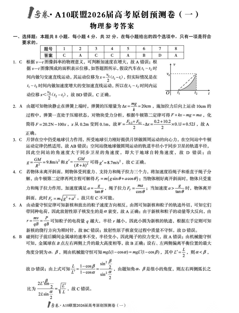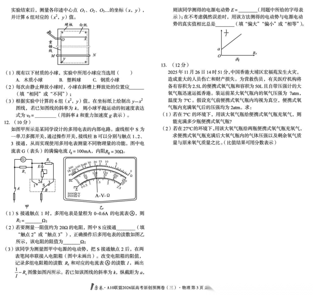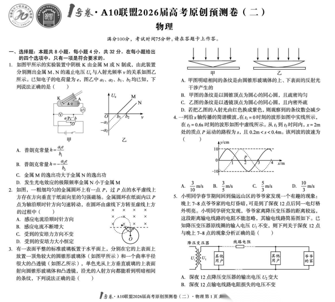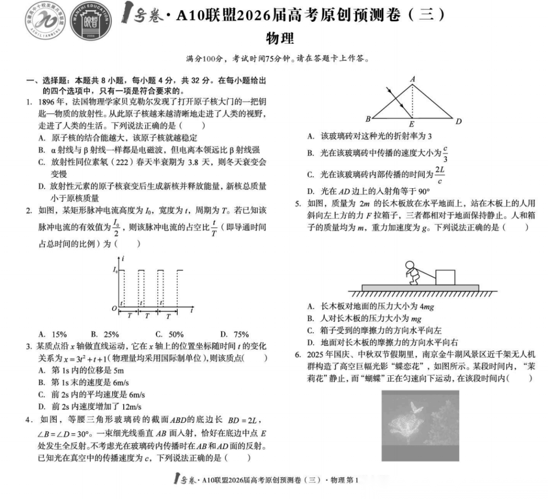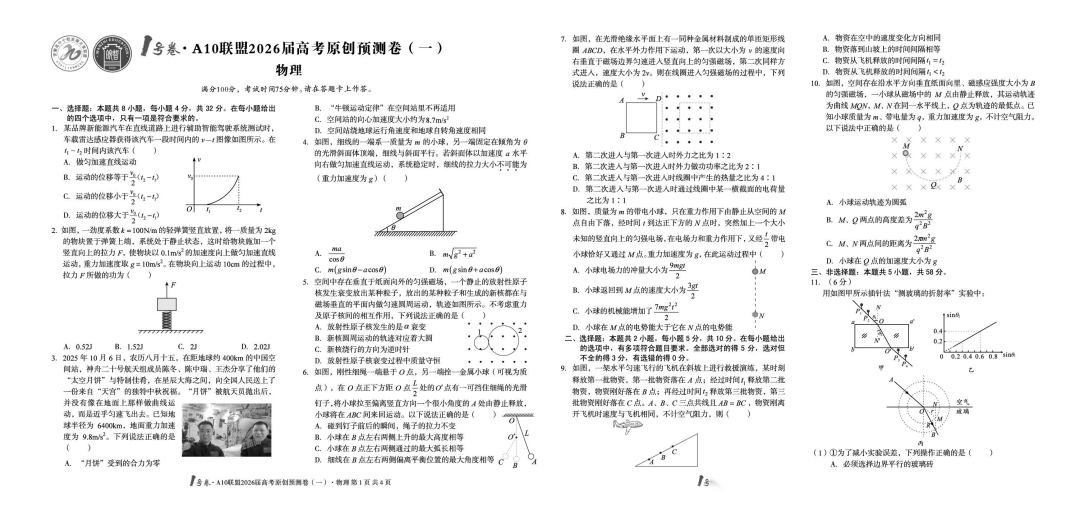 【安徽卷】【物理预测卷】安徽1号卷·A10联盟2026届高三下学期高考原创预测卷(一)(二)(三) 物理三套试题卷+答案