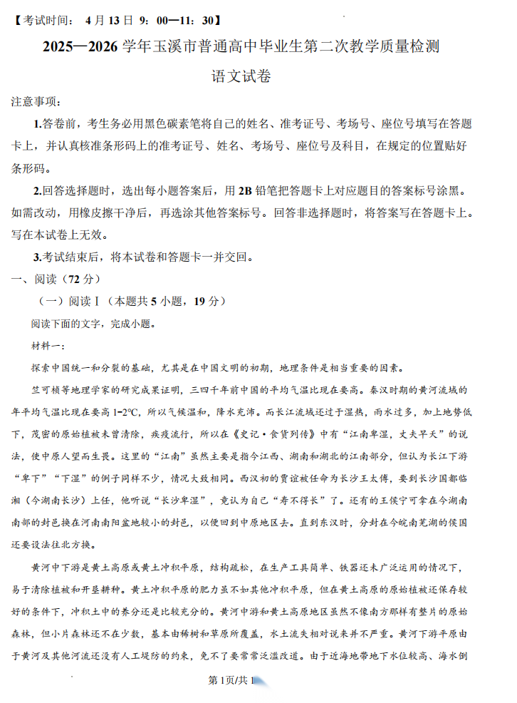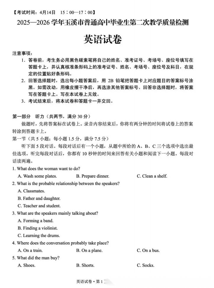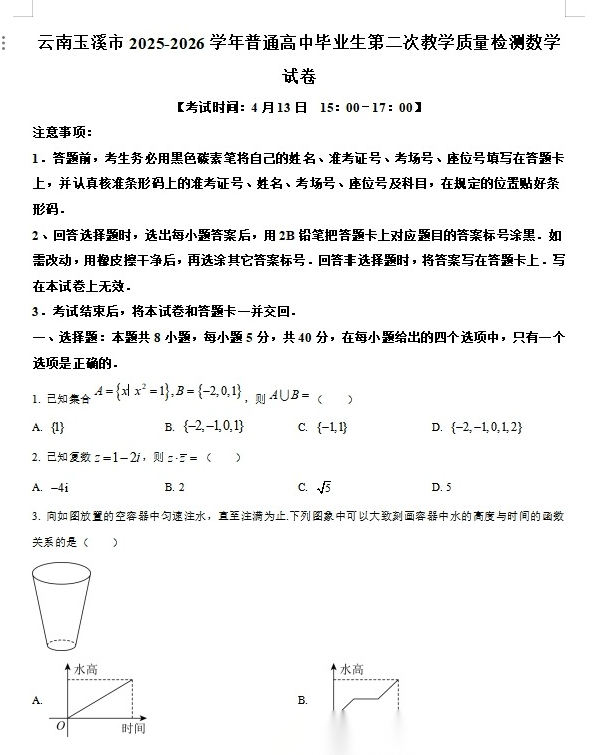 【云南卷】云南省玉溪市2025一2026学年普通高中毕业生高三年级第二次教学质量检测(玉溪二模)(4.13-4.15) 全科试题卷+答案