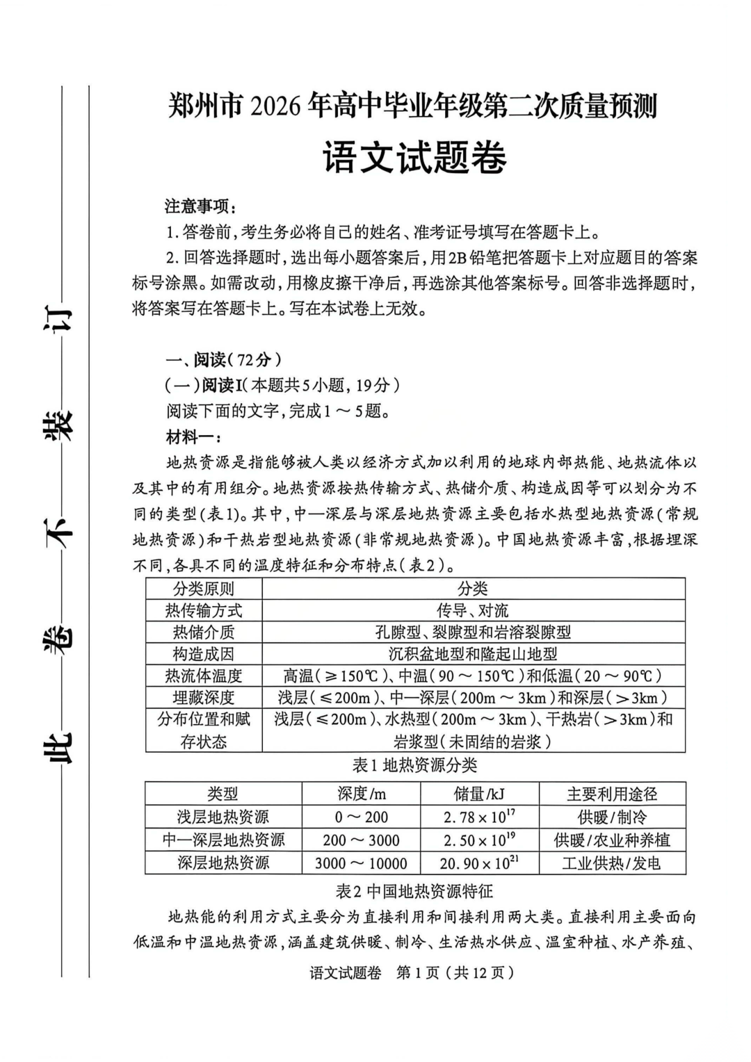 【河南卷】河南省郑州市2026年高中毕业年级高三年级第二次质量预测(郑州二模)(4.20-4.22) 数学语文试题卷+答案 【河南卷】河南省郑州市2026年高中毕业年级高三年级第二次质量预测(郑州二模)(4.20-4.22) 数学语文试...
