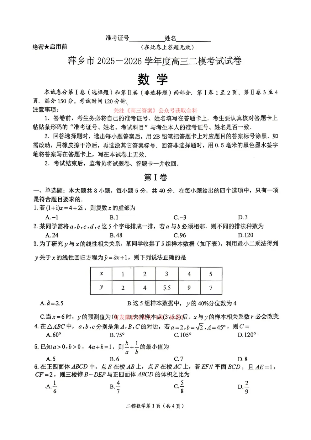 辽宁协作体2026年4月高考模拟考试答案 辽宁协作体2026年4月高考模拟考试答案