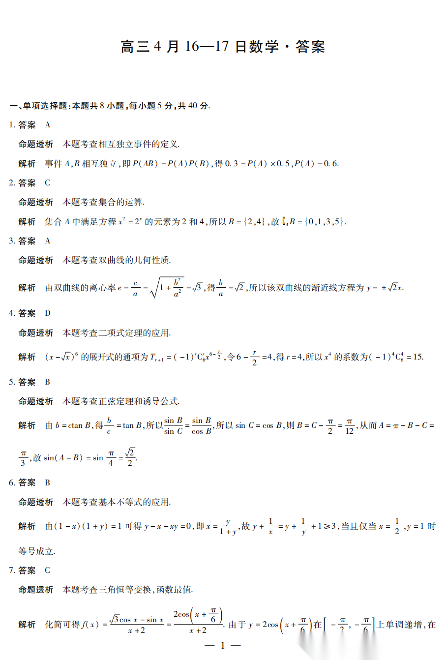 2026年4月暨阳联谊学校高三联考答案 2026年4月暨阳联谊学校高三联考答案