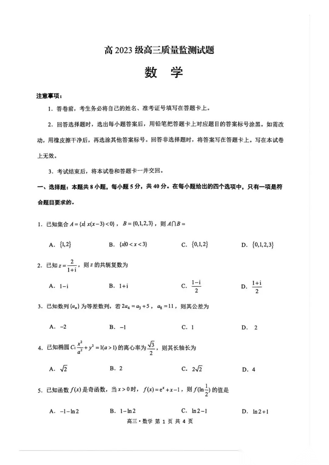 2026年4月四川泸州高三三诊质量监测【泸州三诊】