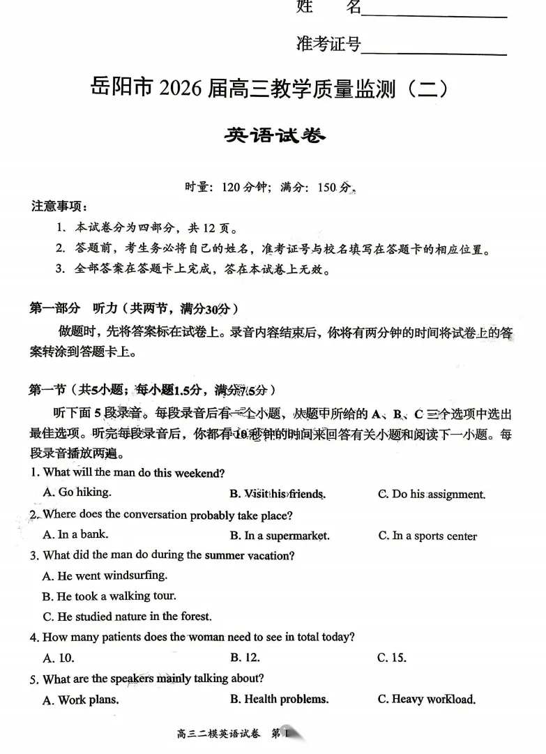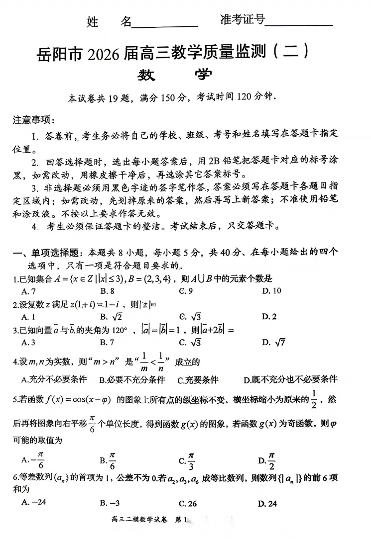 【补齐重发】【湖南卷】湖南省岳阳市2026届高三年级4月教学质量监测(二)(岳阳高三二模)(4月16-17日) 全科试题卷+答案