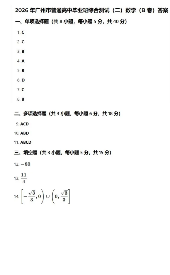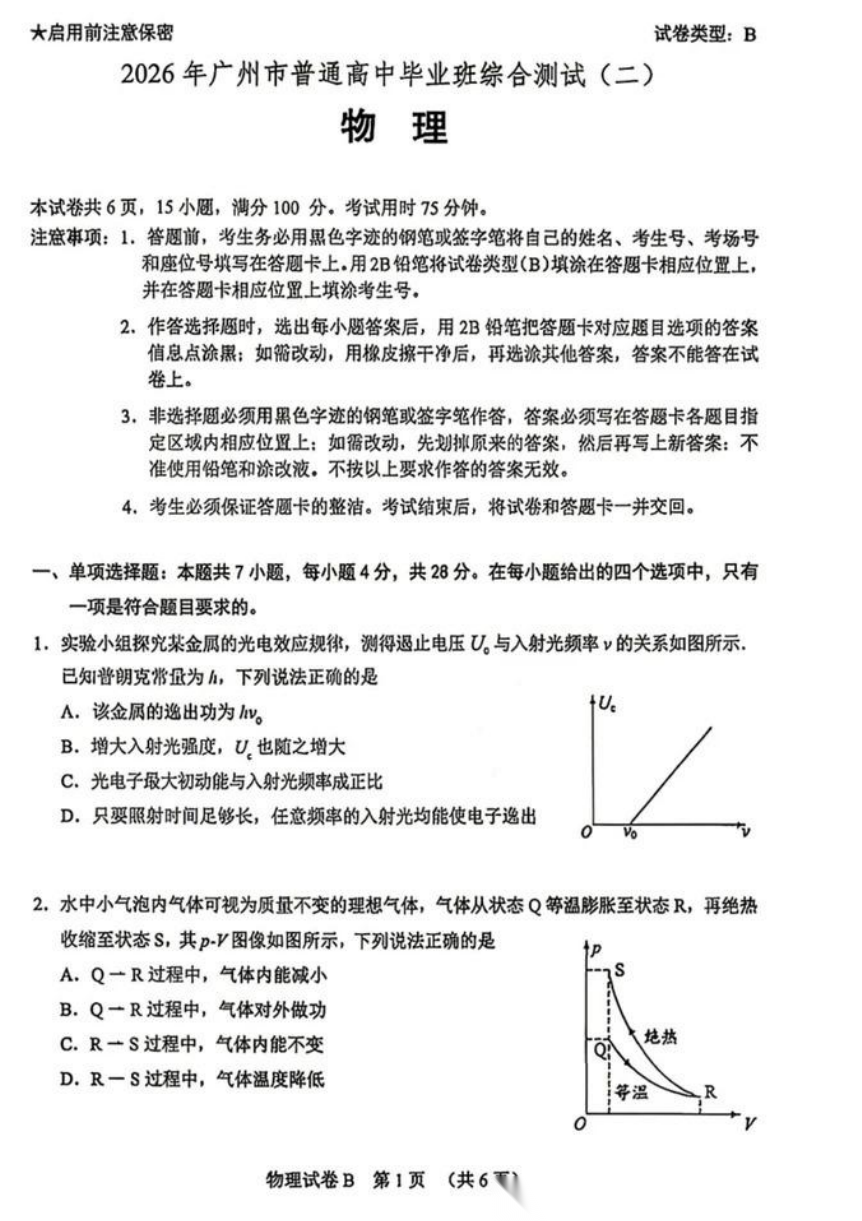 【广东卷】广东省广州市2026年广州市普通高中毕业班综合测试(二)(广州二模)(4.20-4.22) 数学物理英语语文历史试题卷+答案