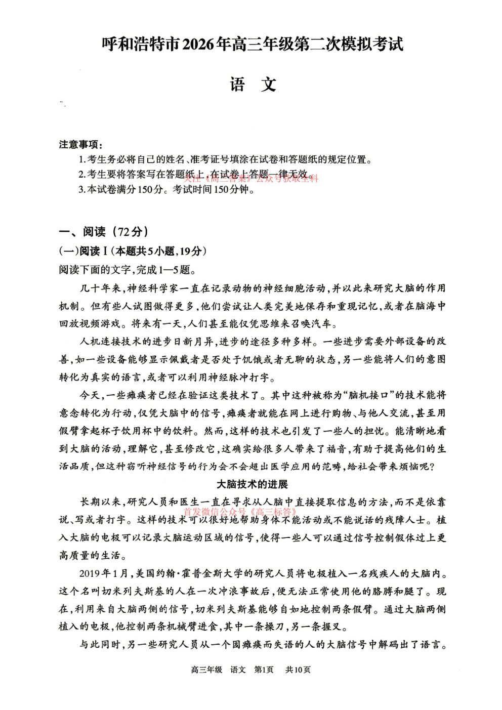 【呼和浩特市二模】2026年高三年级第二次模拟考试答案