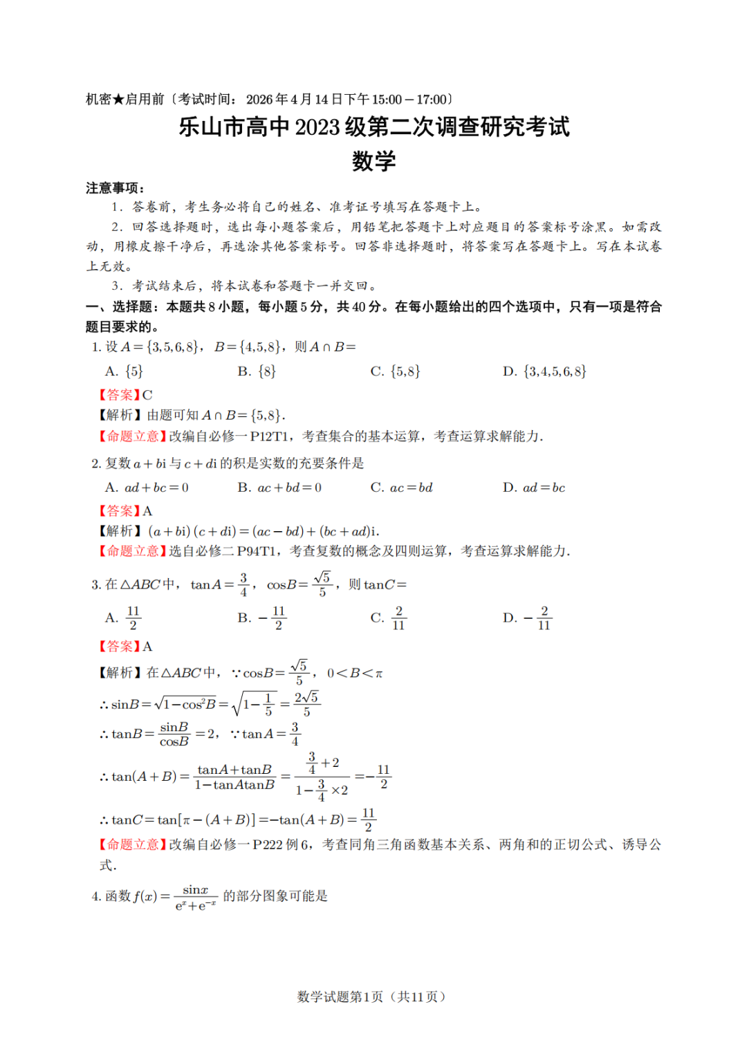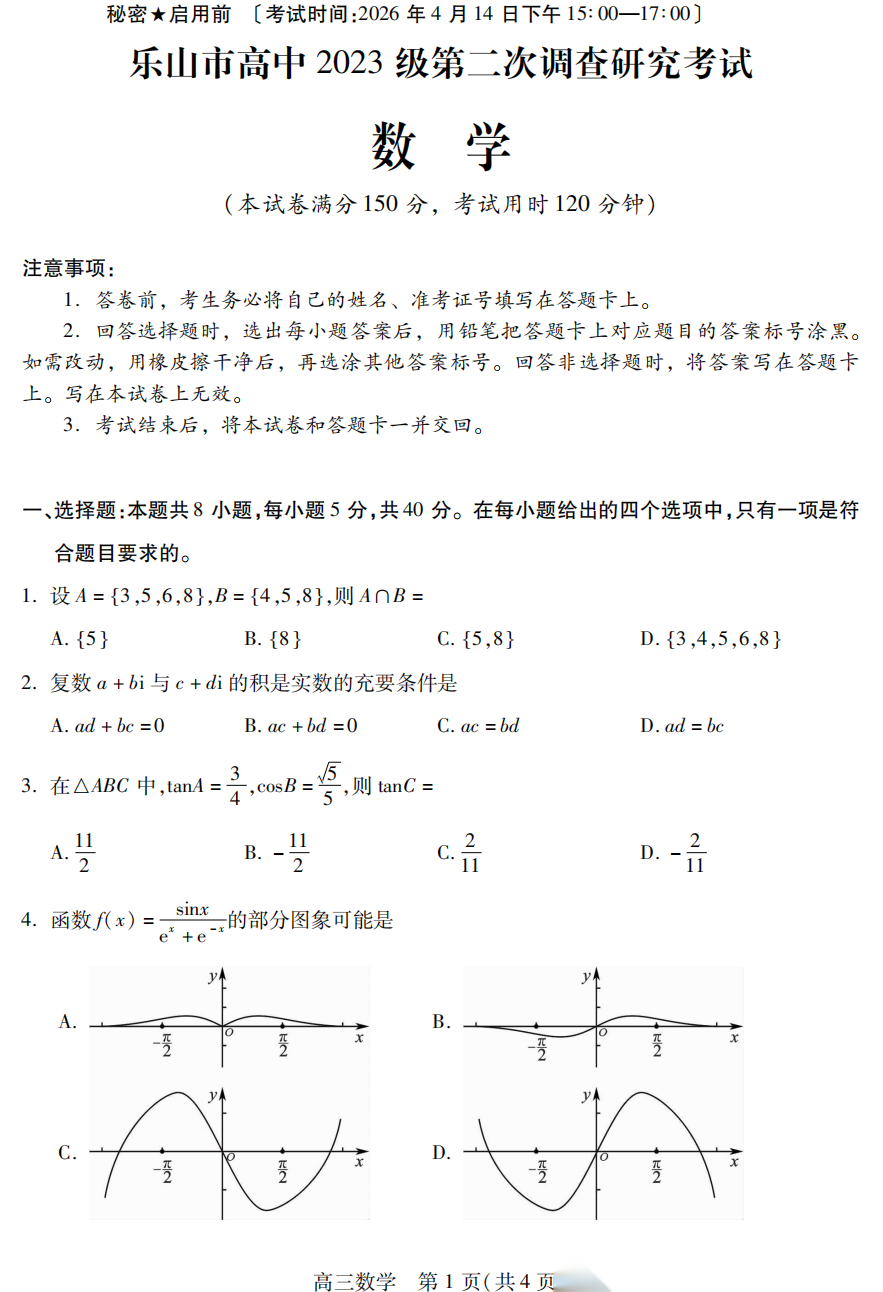 【乐山二调全科】四川省乐山市高中2026届第二次调查研究考试