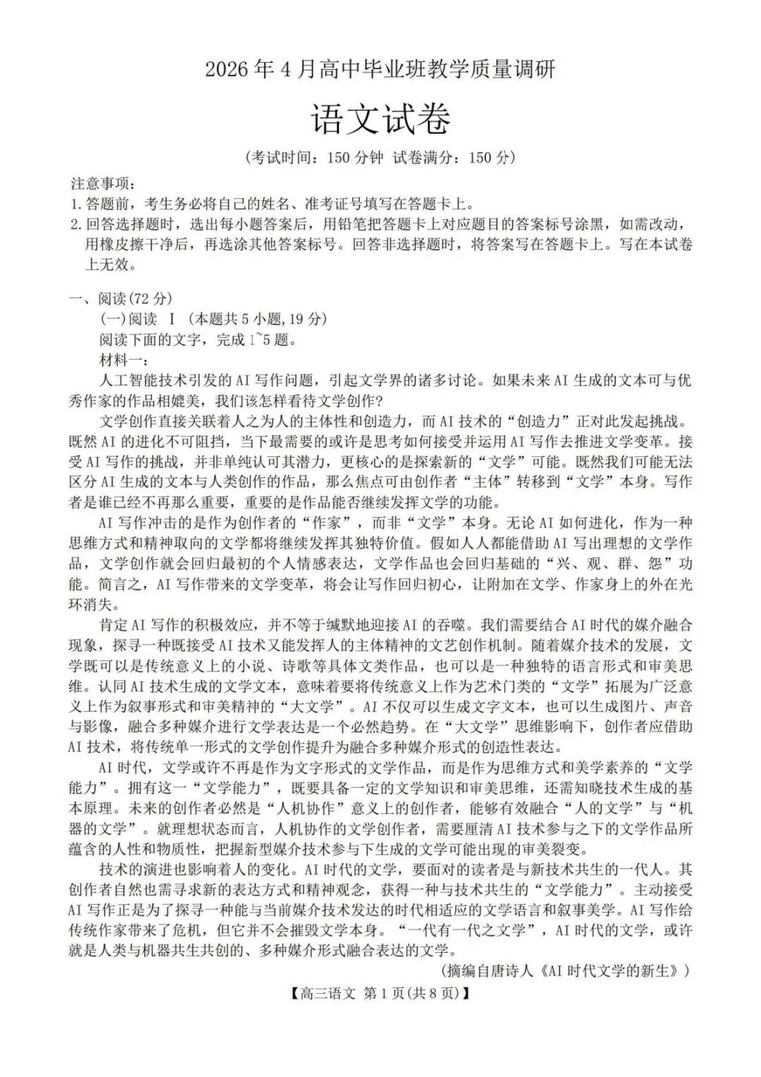 2026年4月广西南宁高三三模毕业班教学质量调研【南宁三模】